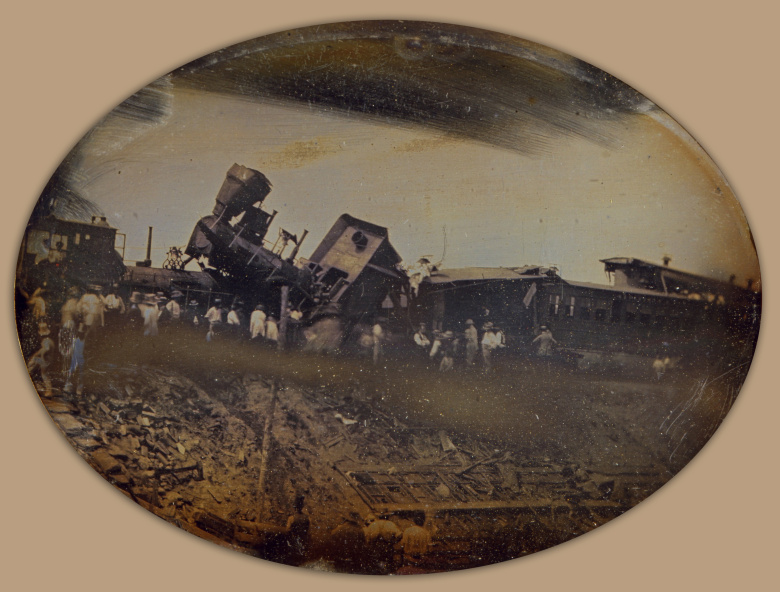 Столкновение пассажирских поездов на линии Провиденс – Вустер (штат Род-Айленд) 12 августа 1853 г. Этот дагерротип работы Л. Райта (L.Wright) — первая в истории фотография железнодорожной катастрофы