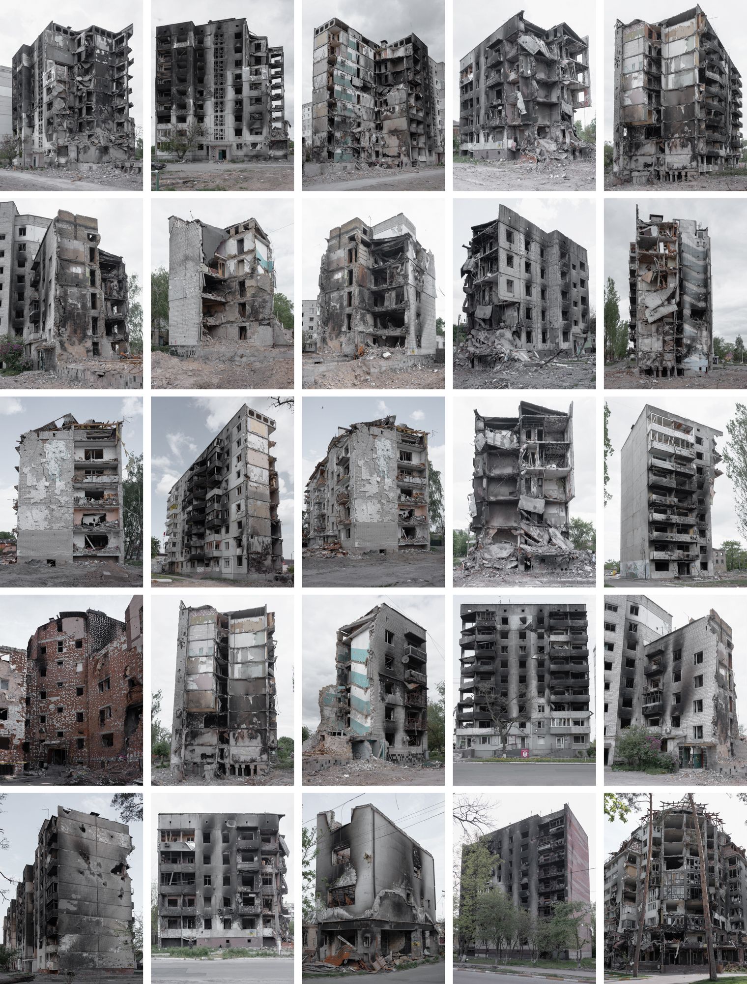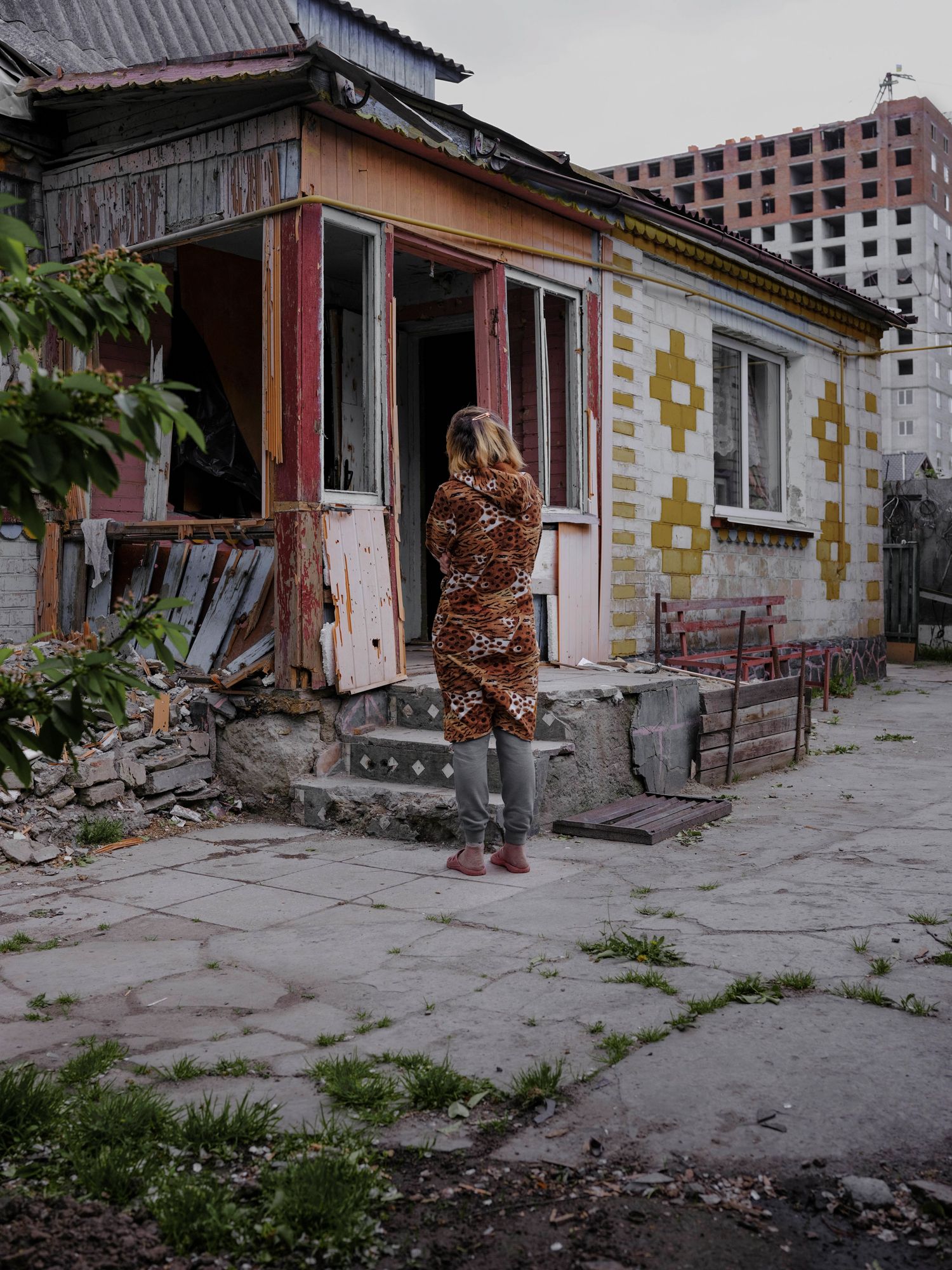 В Ирпене почти на всех домах следы проходивших здесь ожесточенных боев, когда городок превратился в ничейную землю между рекой, удерживаемой украинскими силами, и Бучей, оккупированной россиянами. Убогая архитектура этих окраин придает разрушениям особенно удручающий вид; теплоизоляционные плиты из пенопласта, приклеенные к фасадам частных домов и небольших строений и спрятанные под слоем штукатурки, теперь сорваны, разбросаны и обуглены взрывами. Остались голые почерневшие стены в комочках строительной пены, на которых эти плиты держались.