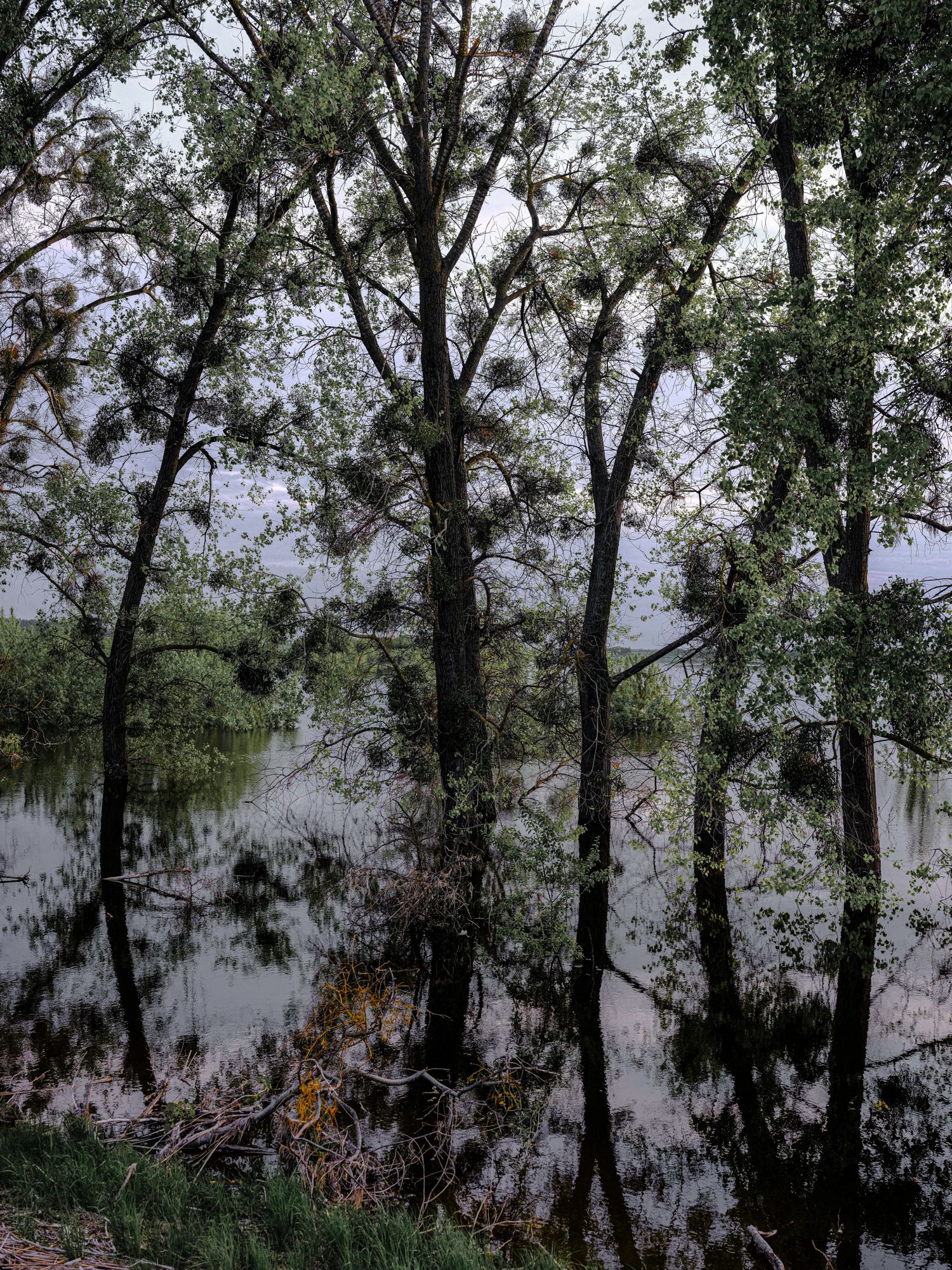 Чуть дальше находится большой разрушенный мост c импровизированными пешеходными мостками вровень с водой, по которым беженцы переправлялись на другой берег; там же все еще лежит перевернутый в начале марта белый фургон, теперь облепленный патриотическими картинками и плакатами. На самом мосту на месте затора, образовавшегося из брошенных машин, расположился блокпост и строительная техника. Под ним объездная дорога вдоль реки уже заасфальтирована.