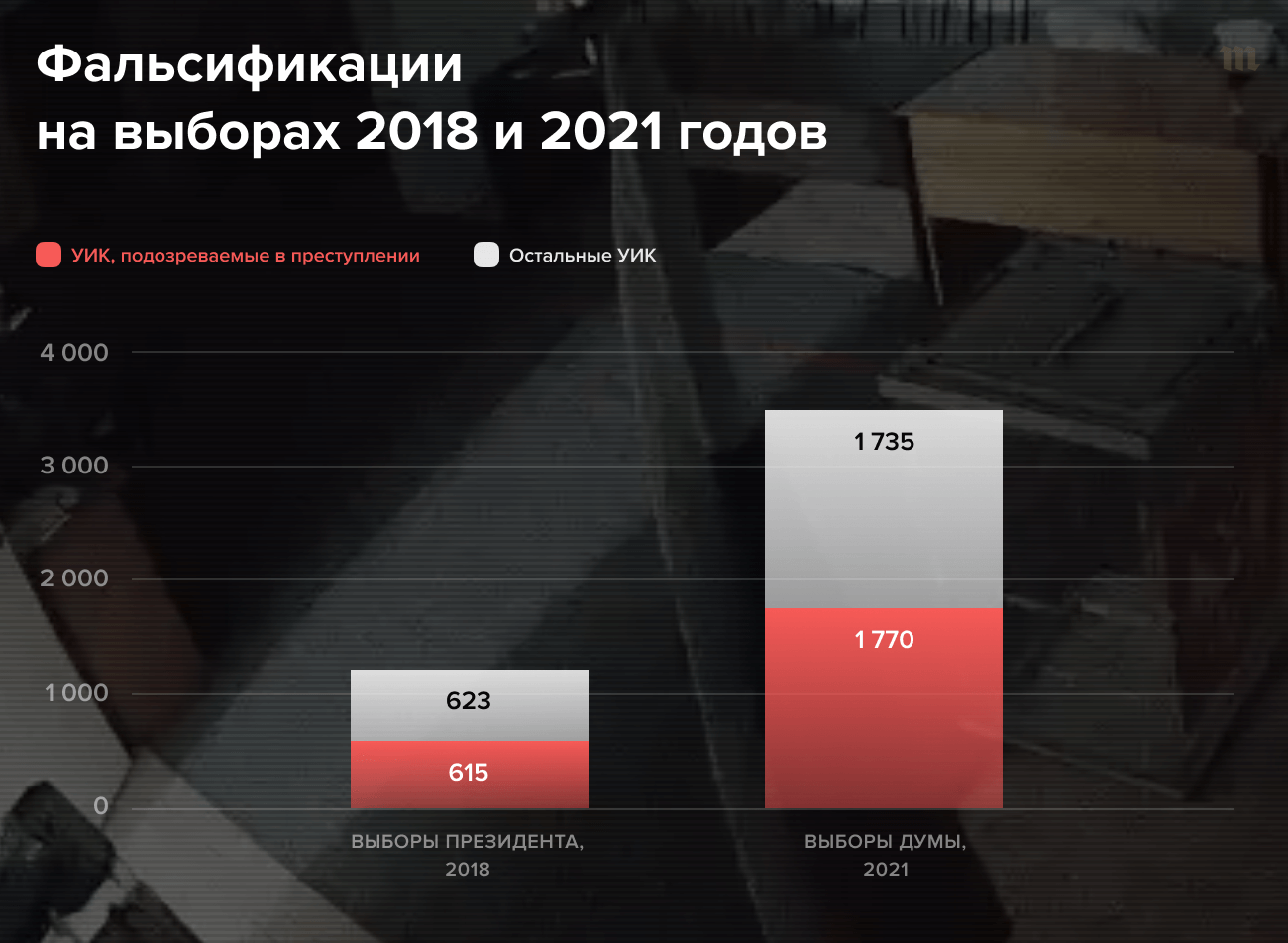 По оценке математика Сергея Шпилькина, постоянно анализирующего голосование в России, на президентских выборах 2018-го было порядка 10 миллионов сфальсифицированных голосов — а на думских их количество выросло практически до 14 миллионов.