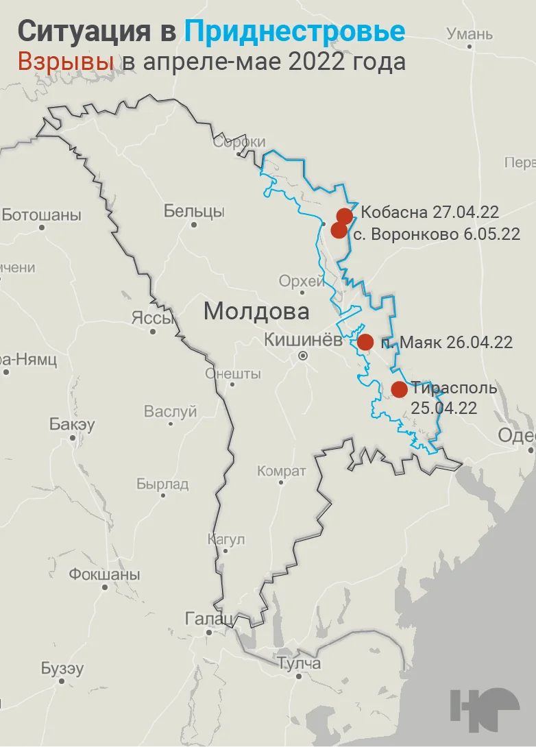27 апреля Министерство внутренних дел Приднестровья сообщило, что с помощью дронов, якобы прилетевших с украинской территории, был обстрелян населённый пункт Кобасна, где располагается крупный склад оружия;
