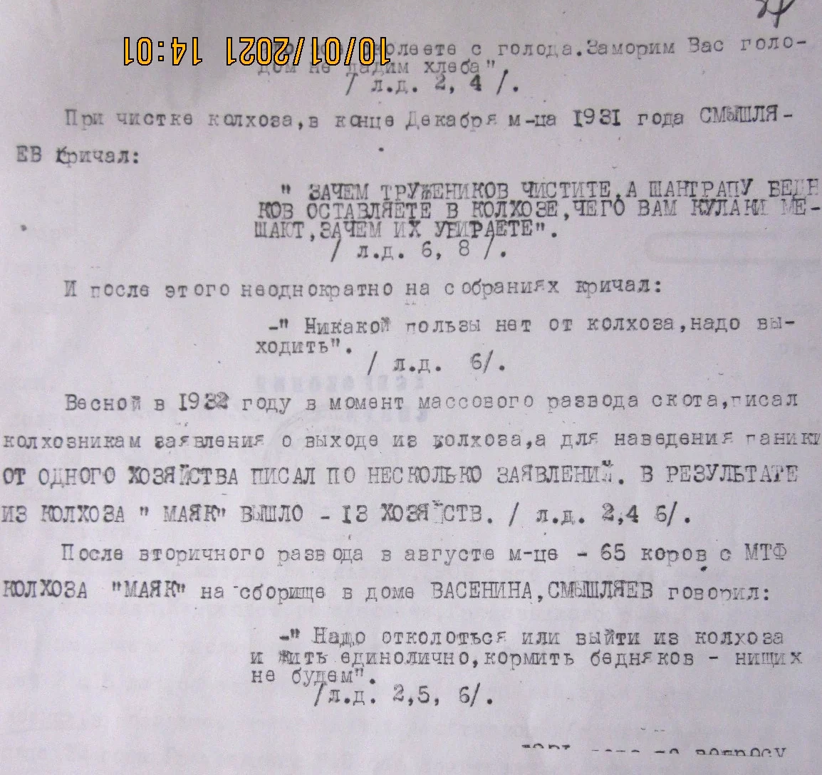 «При чистке в колхозе в конце декабря 1931 года Смышляев кричал: «Зачем тружеников чистите, а шантрапу оставляете в колхозе, чего вам кулаки мешают, зачем их убираете?» — это фрагмент обвинительного заключения по делу крестьянина из вологодской деревни Киселево. В 1932 году по приговору тройки Дмитрий Смышляев получил 3 года лагерей. Статья 58.10: «Пропаганда или агитация, содержащие призыв к свержению, подрыву или ослаблению Советской власти». Отбыл срок в Коми, вернулся, летом 1941-го ушел на фронт, 18 октября того же года погиб.