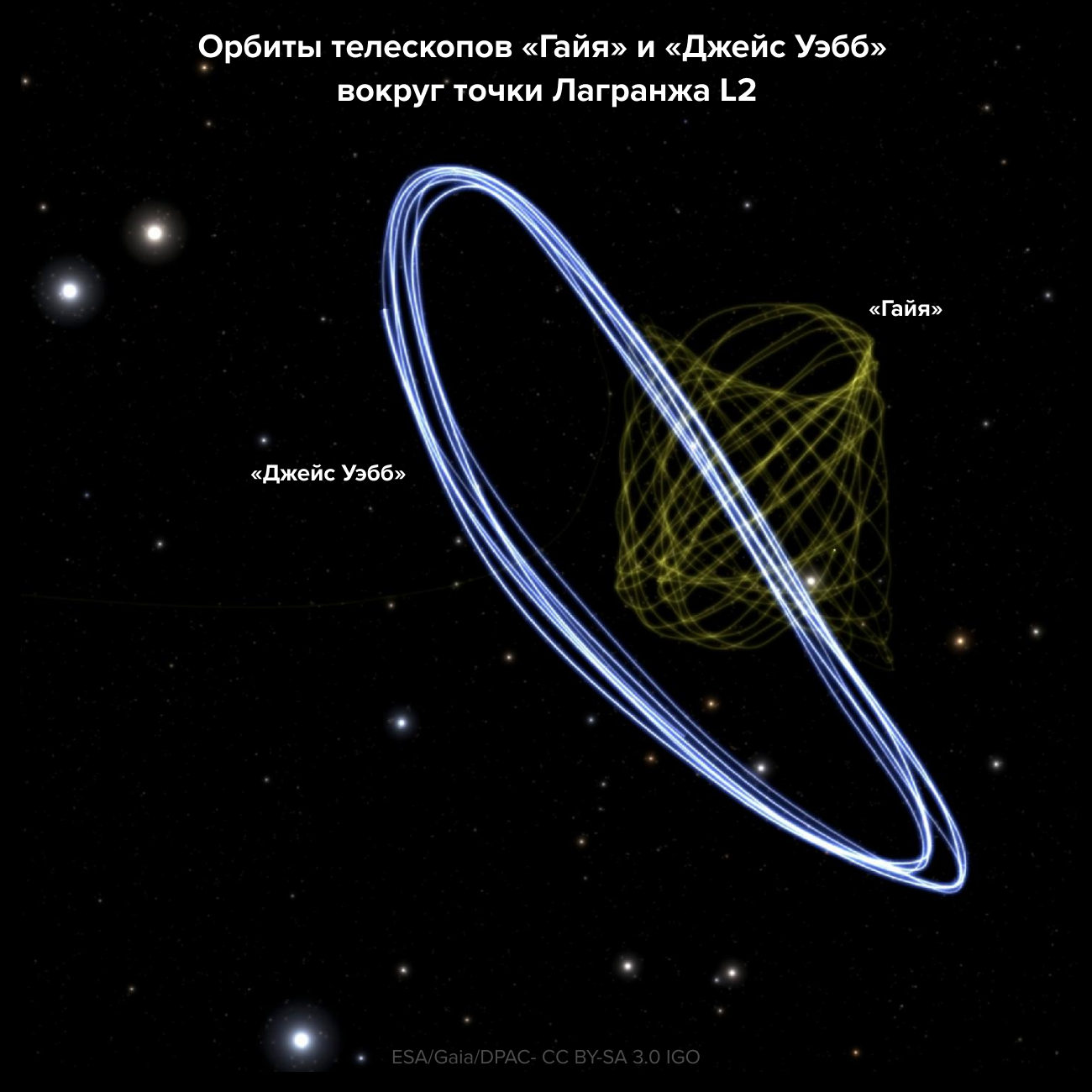 Чтобы избежать столкновений и контролировать свое положение, все телескопы в точке L2 на самом деле двигаются по сложным орбитам, называемым фигурами Лиссажу. Расход топлива, который необходим для движения по этим орбитам, определяет время жизни каждого телескопа. «Гайя» была запущена с расчетом на пять лет работы, но экономный расход топлива, по последним прикидкам, поможет телескопу проработать до 2025 года. Камера «Гайи», кстати, несколько раз наблюдала телескоп «Уэбба», еще когда он только летел к точке L2, и сделала то, что умеет делать лучше всех в мире, — измерила его координаты и скорость. Оказалось, что новейший телескоп находится (всего) в 40 метрах от своей расчетной траектории — коррекцией это небольшое, но все-таки отклонение было исправлено. Слежение за положением телескопа Уэбба не только повысит точность его наведения, но и поможет продлить срок работы из-за более эффективного использования топлива для движения по тем самым орбитам Лиссажу. Теперь «Гайя», хоть это никогда не было целью миссии, и дальше будет периодически проверять положение телескопа Уэбба.