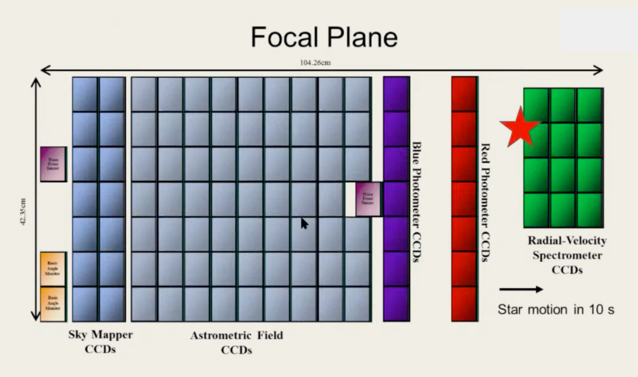 Функционально матрица «Гайя» разделена на несколько участков, которые каждая звезда последовательно проходит. Сначала свет попадает на Sky mapper — полосу камеры шириной всего в несколько пикселей, — где он регистрируется и включает алгоритмы слежения на основной матрице.