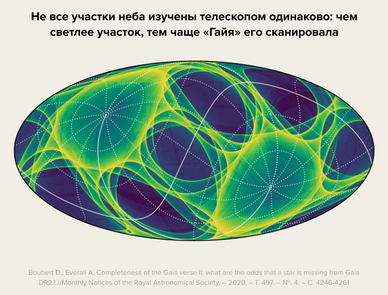 Сложная орбита телескопа (одновременное вращение вокруг своей оси, движение вокруг точки Лагранжа L2 и по орбите вокруг Солнца) приводит к тому, что «Гайя», хотя и видит все небо, видит его очень неравномерно: какие-то участки наблюдаются десятки раз, а куда-то телескоп заглядывает всего однажды.
