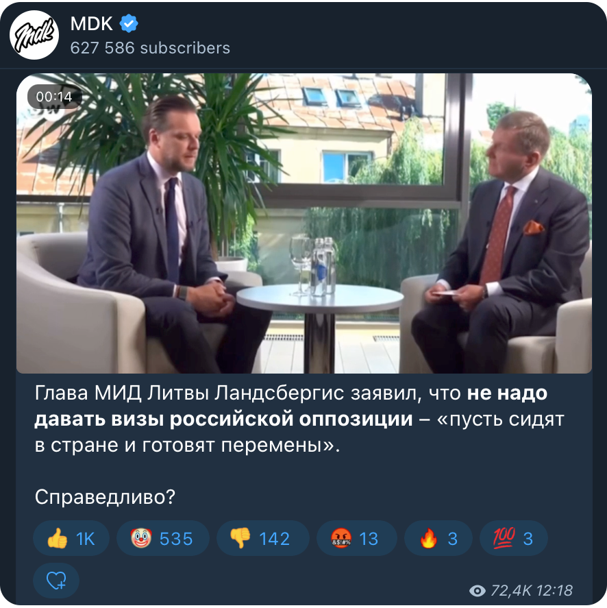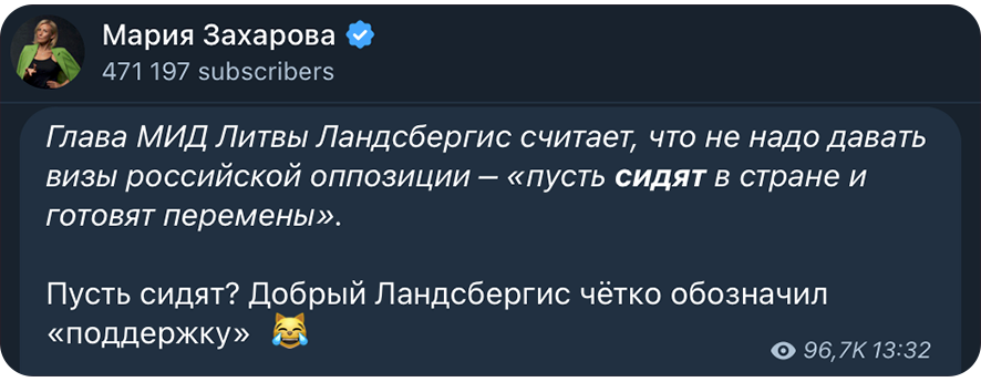 «Глава МИД Литвы Ландсбергис считает, что не надо давать визы российской оппозиции — „пусть сидят в стране и готовят перемены“», — написала Захарова. Эта фраза почти полностью совпадает с сообщением телеграм-канала MDK, которое вышло за час до публикации Захаровой. «Пусть сидят? Добрый Ландсбергис четко обозначил „поддержку“», — заявила представитель МИД РФ.