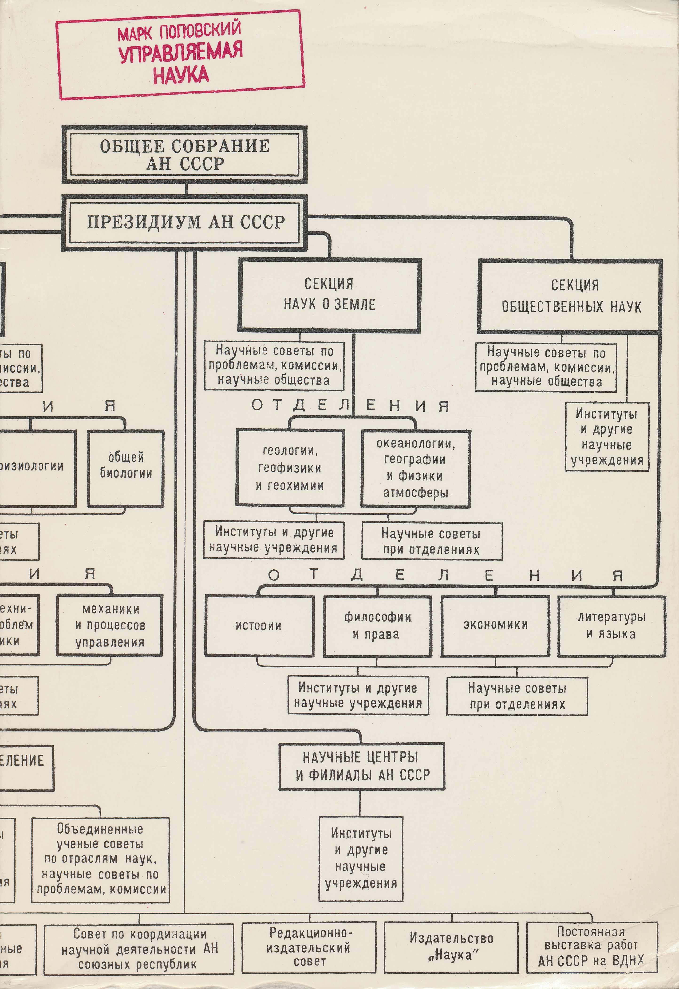 Марк Поповский: Не только имеет значение, но и решающим образом предопределяет отставание советской науки. Кроме того, такая ситуация, что научные исследования ведутся у нас не в университетах, в значительной степени обоснована нашей социальной системой. С самого начала, желая иметь в руках вожжи управления всеми сферами жизни, большевистская партия организовывала науку, а наука наша организовывалась в начале 1930-х годов по тем же самым принципам, в той же самой системе, что армия, партия – прежде всего, должен быть начальник высший, подразделения вышестоящие, нижестоящие.