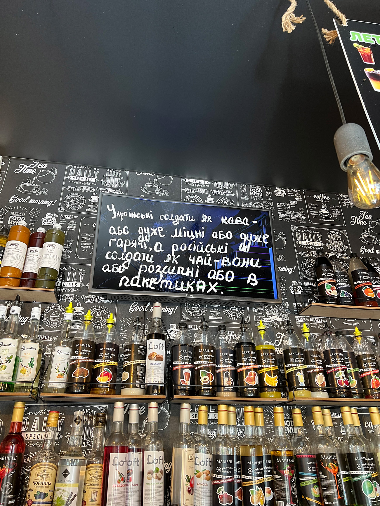 В небольшой уличной кофейне на стенде надпись: «Украинские солдаты как кофе — или очень крепкие, или очень горячие. Российские солдаты как чай — либо россыпью, либо в пакетиках».