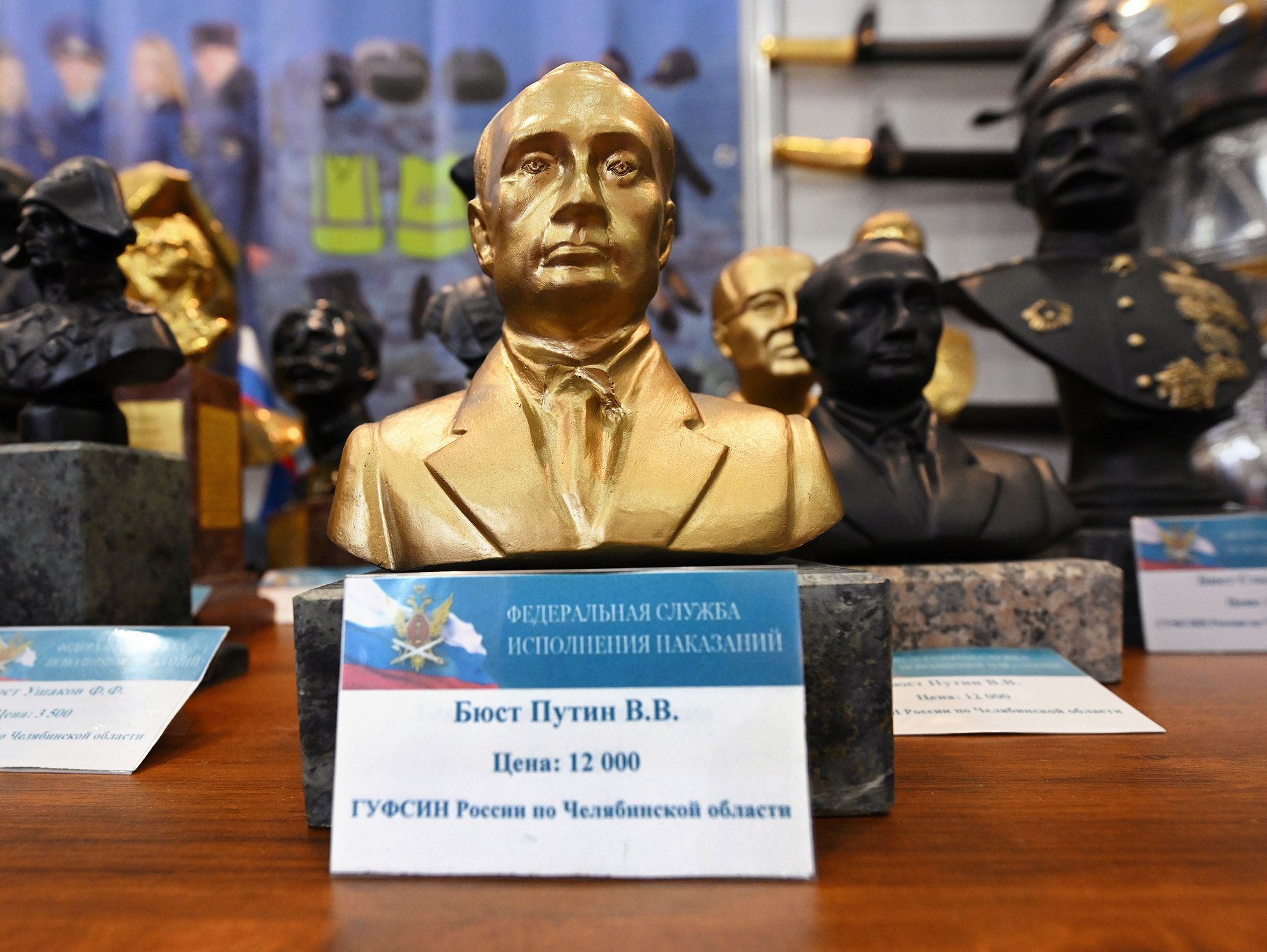 A stand run by the Russian Federal Penitentiary Service's Chelyabinsk regional office included busts of Vladimir Lenin, Joseph Stalin, Lavrentiy Beria, and Vladimir Putin, all molded by Russian prisoners. According to the employee manning the stand, Russian prisoners make the busts by pouring molten metal in wooden molds. The busts reportedly cost between 12,000 rubles ($197) and 25,000 rubles ($410).