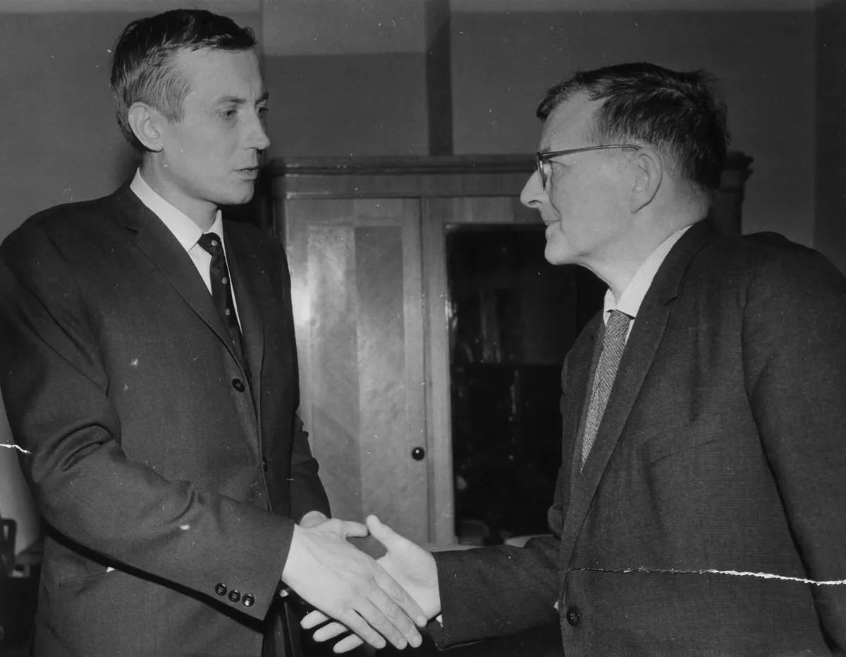 А когда я оказался на сцене рядом с гением и Шостакович взял мою руку в свою — сухую, горячую — я все еще не мог осознать, что это реальность…» (см. сноску 16)