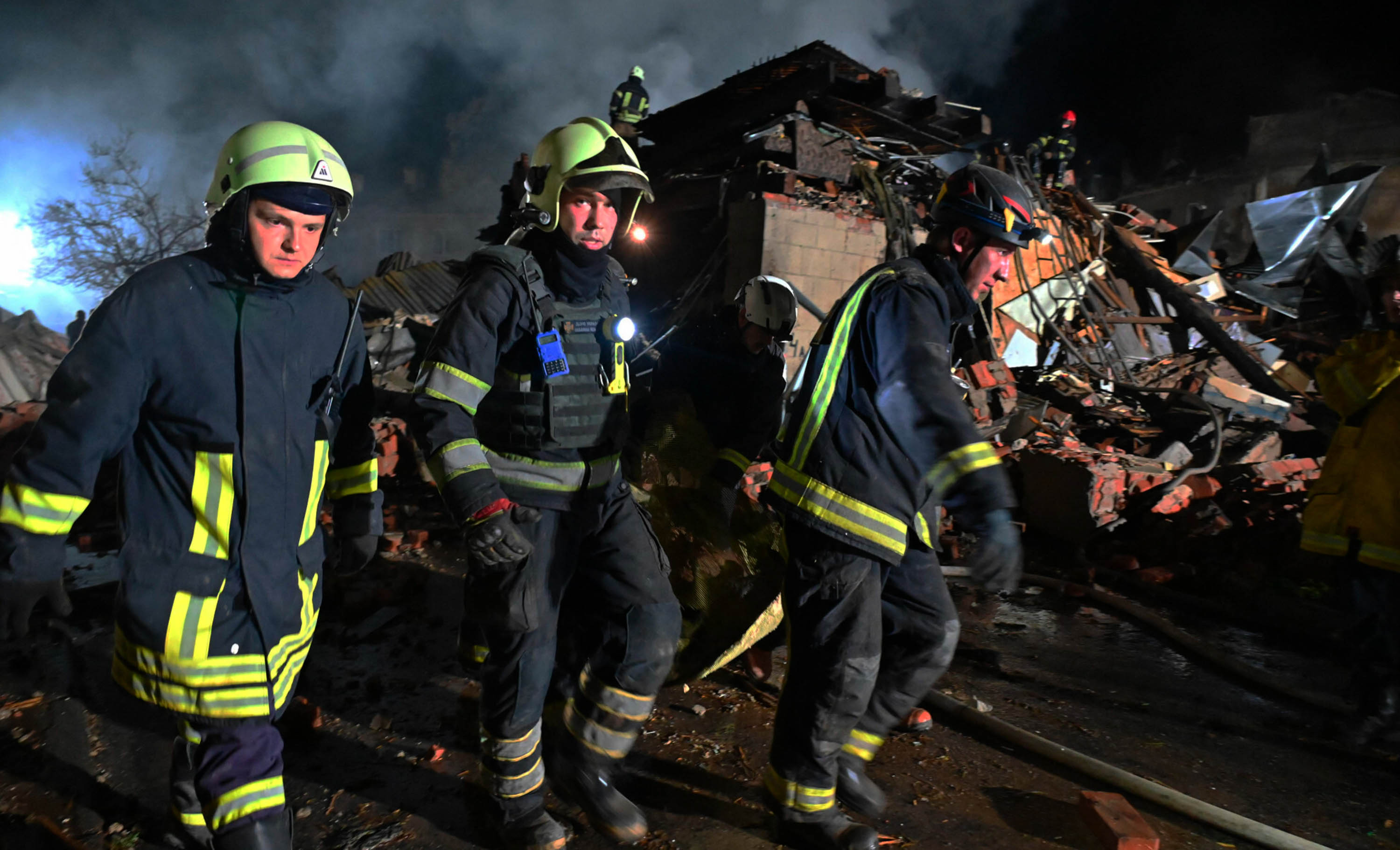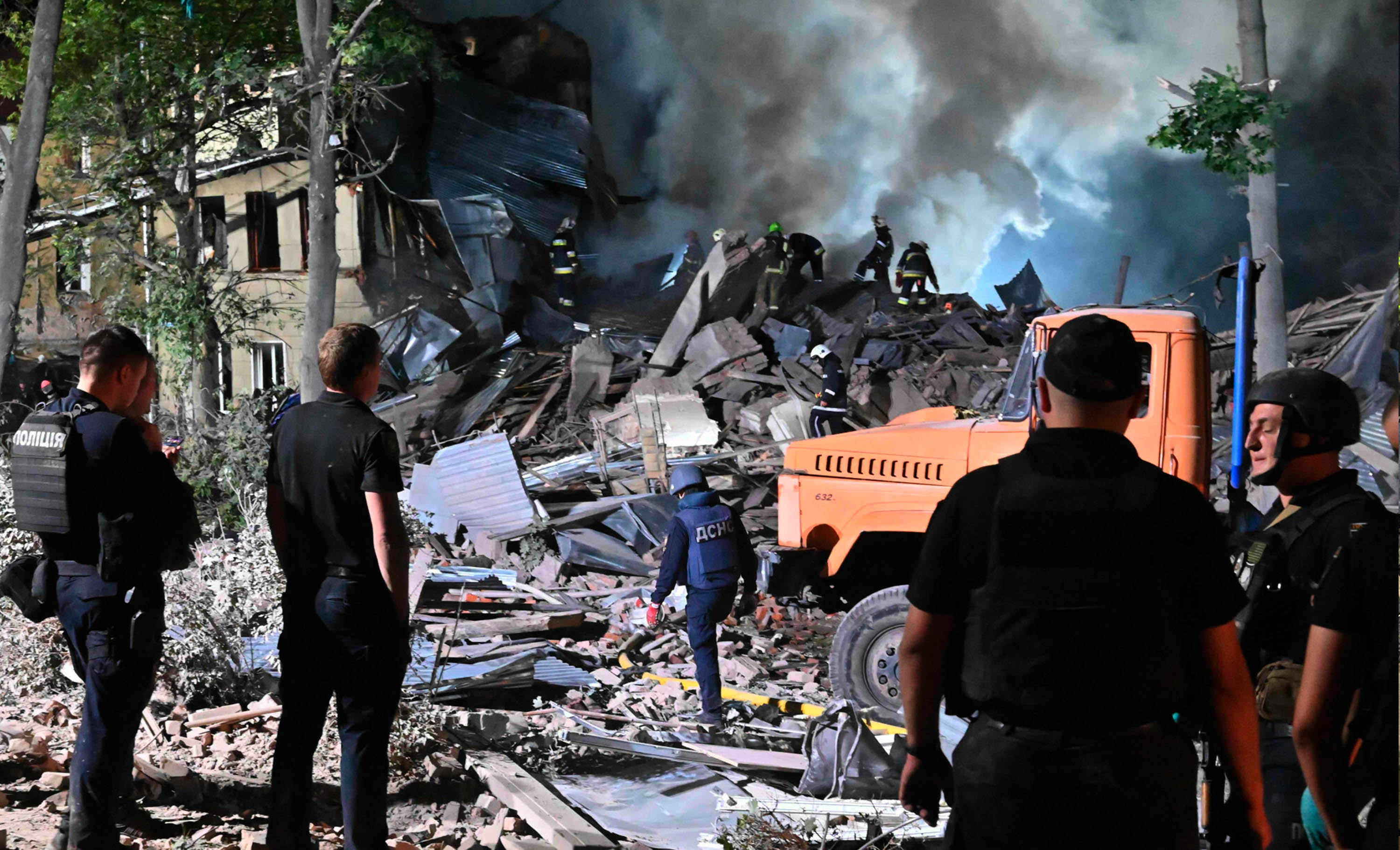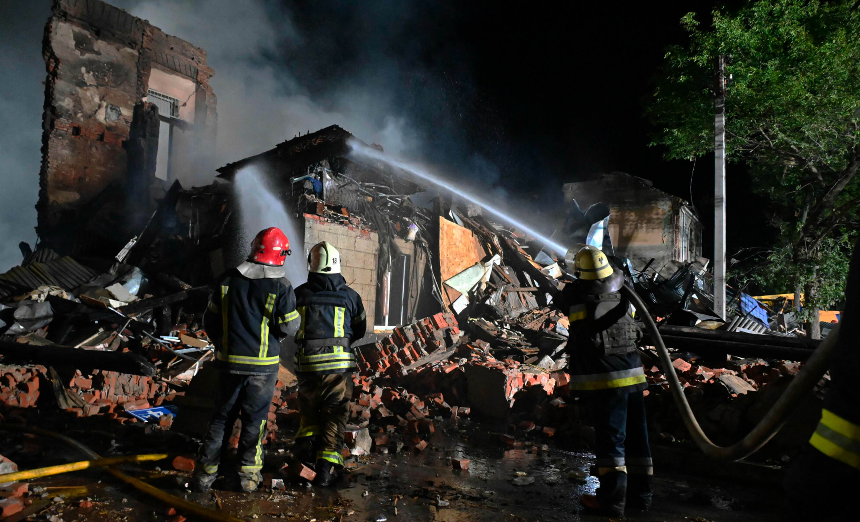 Пожарные на месте разрушенного общежития в Харькове, 17 августа 2022 года. Фото: Sergey Bobok / AFP