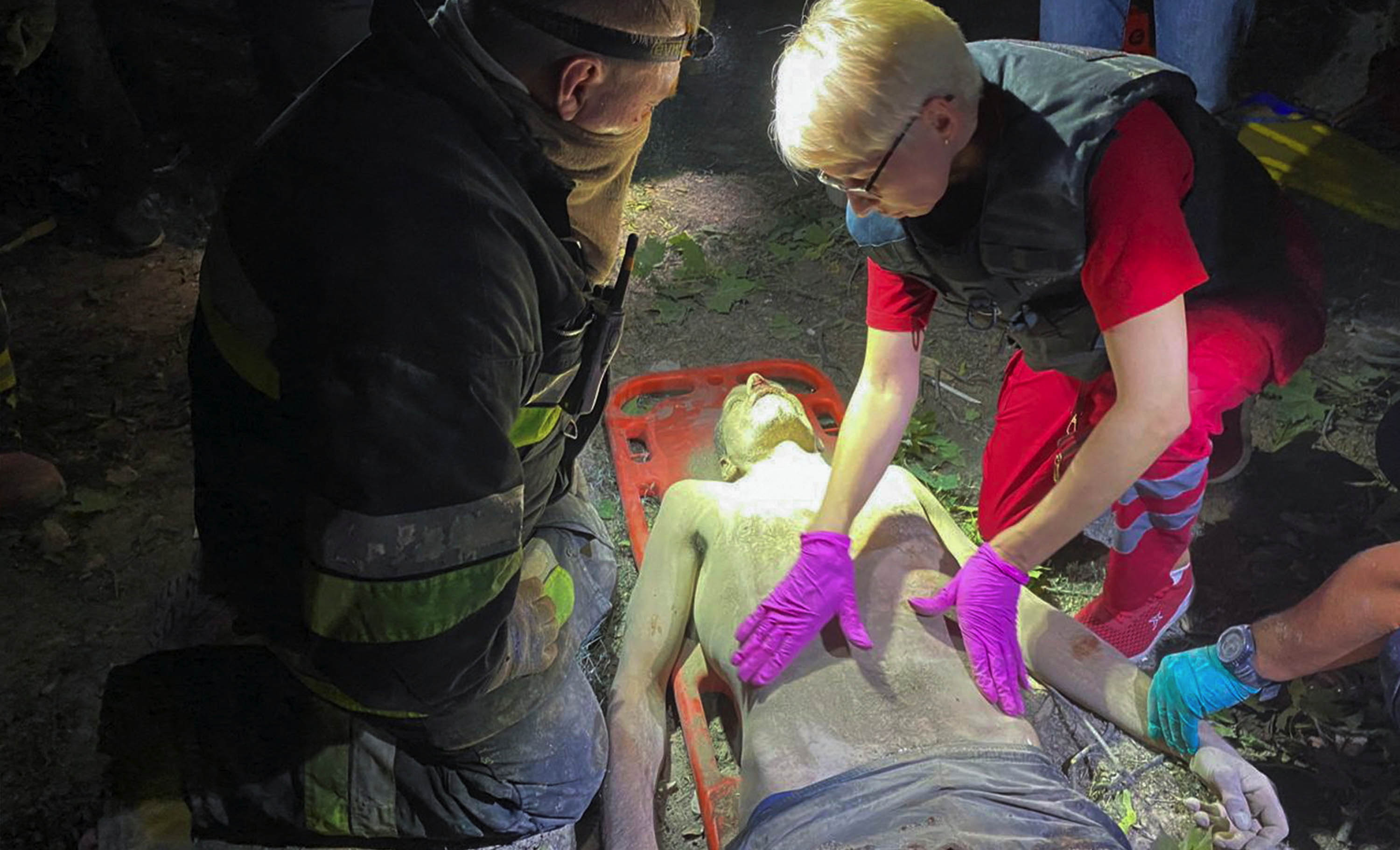 Медики помогают мужчине, освобожденному из-под обломков общежития, Харьков, 17 августа 2022 года. Фото: Vitalii Hnidyi / Reuters