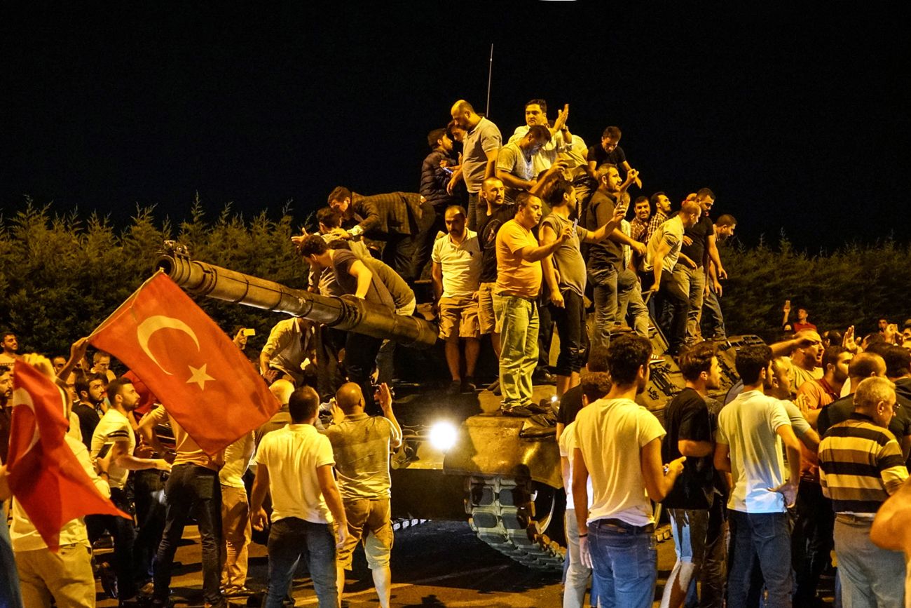 Переворот 2016 года начался не глубокой ночью, как обычно, а около 10 часов вечера, когда большая часть населения города еще была на улицах. Военные успели захватить ряд стратегических объектов в крупнейших городах, но этим их успех и был ограничен. Через несколько часов после начала переворота в эфире одного из не захваченных путчистами телеканалов (это был CNN Türk) Эрдоган призвал людей выходить на улицы, чтобы остановить путчистов, — и они откликнулись. В ту ночь из-за столкновений военных и гражданского населения погибло больше 250 человек, более двух тысяч было ранено.