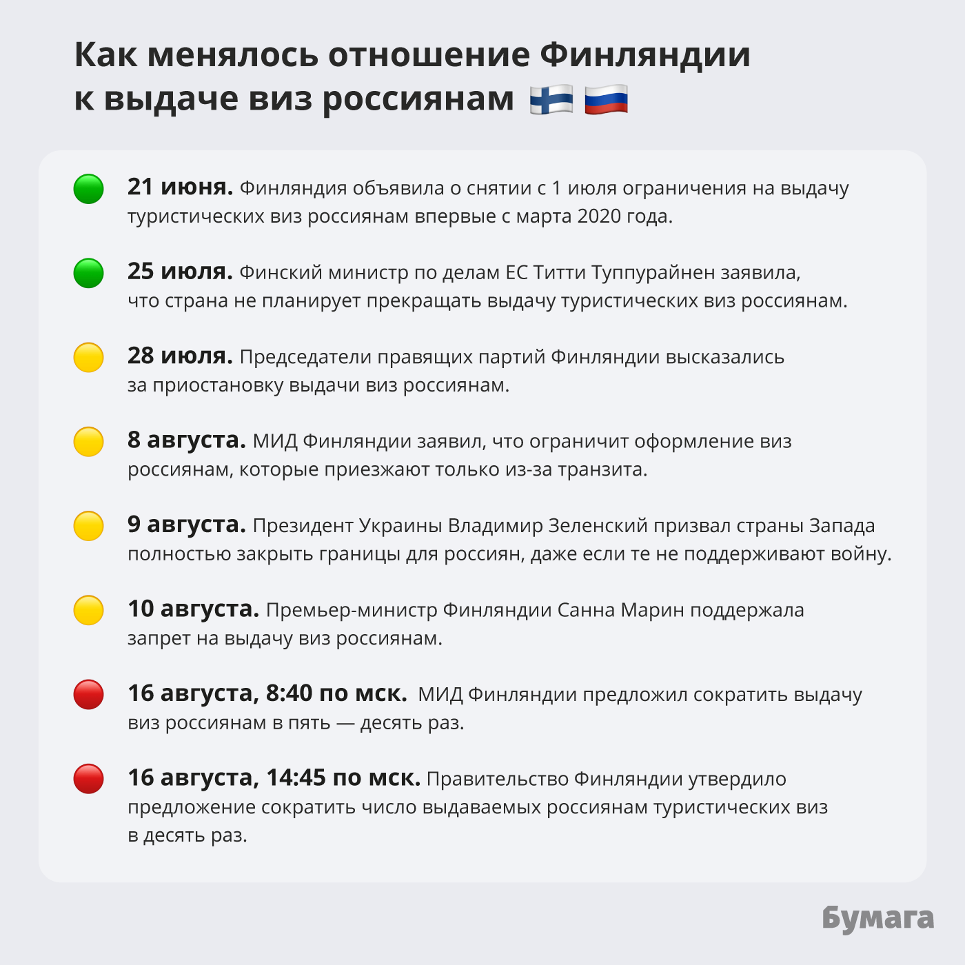 Премьер-министр Финляндии Санна Марин обосновала ограничение на выдачу туристических виз россиянам словами «неправильно, что в то время, когда Россия ведет агрессивную, жестокую агрессивную войну в Европе, русские могут жить нормальной жизнью, путешествовать по Европе, быть туристами». Глава консульской службы министерства иностранных дел Финляндии Юсси Таннера в свою очередь отмечал, что страна хочет ограничить выдачу виз тем россиянам, которые используют их для транзита.