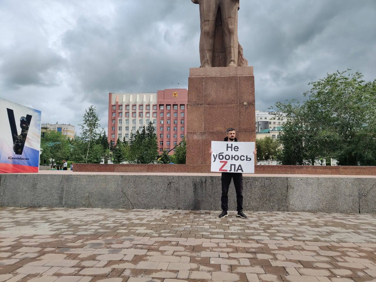 Полиция задержала антивоенного пикетчика 28 июля, когда Виталий Горячих вышел на центральную площадь столицы Забайкалья с плакатом "Не убоюсь zла" - ему удалось простоять два часа до момента задержания.