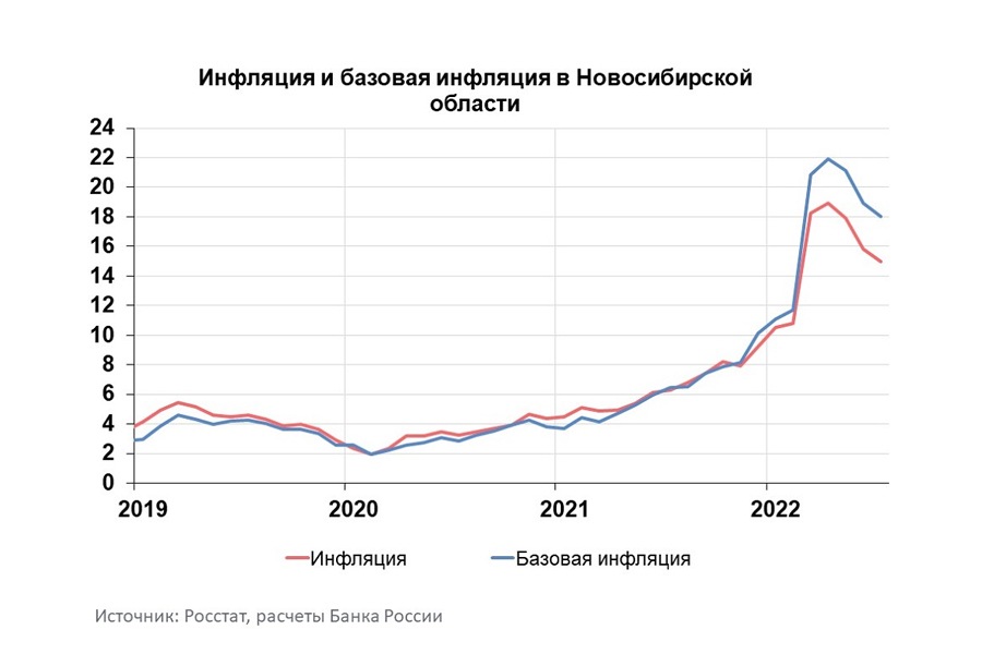 Годовая инфляция в Новосибирской области в июле составила 14,99% после 15,82% в июне. Темп прироста цен был ниже, чем по Сибирскому федеральному округу (16,06%) и по России в целом (15,10%). Рост цен сдерживал свежий урожай на полках и расширение предложения мяса.