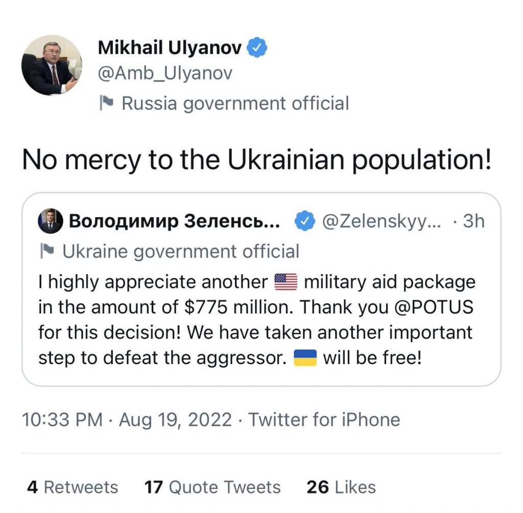 Вечером 19 августа постоянный представитель России при международных организациях в Вене Михаил Ульянов написал в твиттере по-английски «нет пощады украинскому населению» (No mercy to the Ukrainian population). Это было его комментарием к твиту президента Украины Владимира Зеленского с благодарностью руководству США за очередной пакет военной помощи.