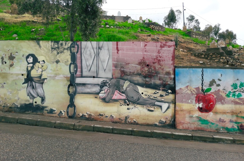 Мурал в городе Акра (иракский Курдистан), изображающий жертв газовой атаки в Халабдже в 1988 году. Зарин, распыленный в этом курдском городе по приказу Саддама Хусейна, стал причиной гибели не менее 5000 мирных жителей.