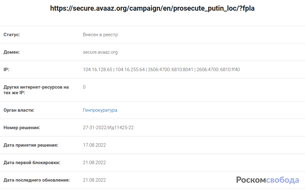 Уже по решению Генеральной прокуратуры следующей в список запрещённой информации попала петиция на сайте Avaaz с требованием провести суд над Президентом России Владимиром Путиным: