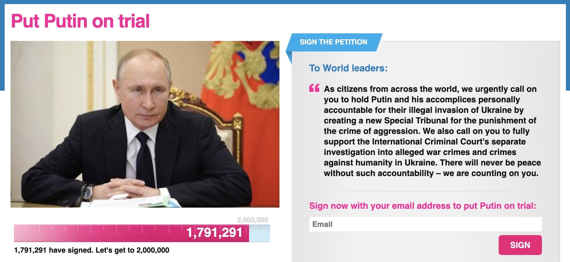 Авторы петиции призывают создать новый Специальный трибунал из-за проводимой на территории Украины так называемой «спецоперации», выделив также в отдельное расследование Международным уголовным судом предполагаемые военные преступления и преступления против человечности.