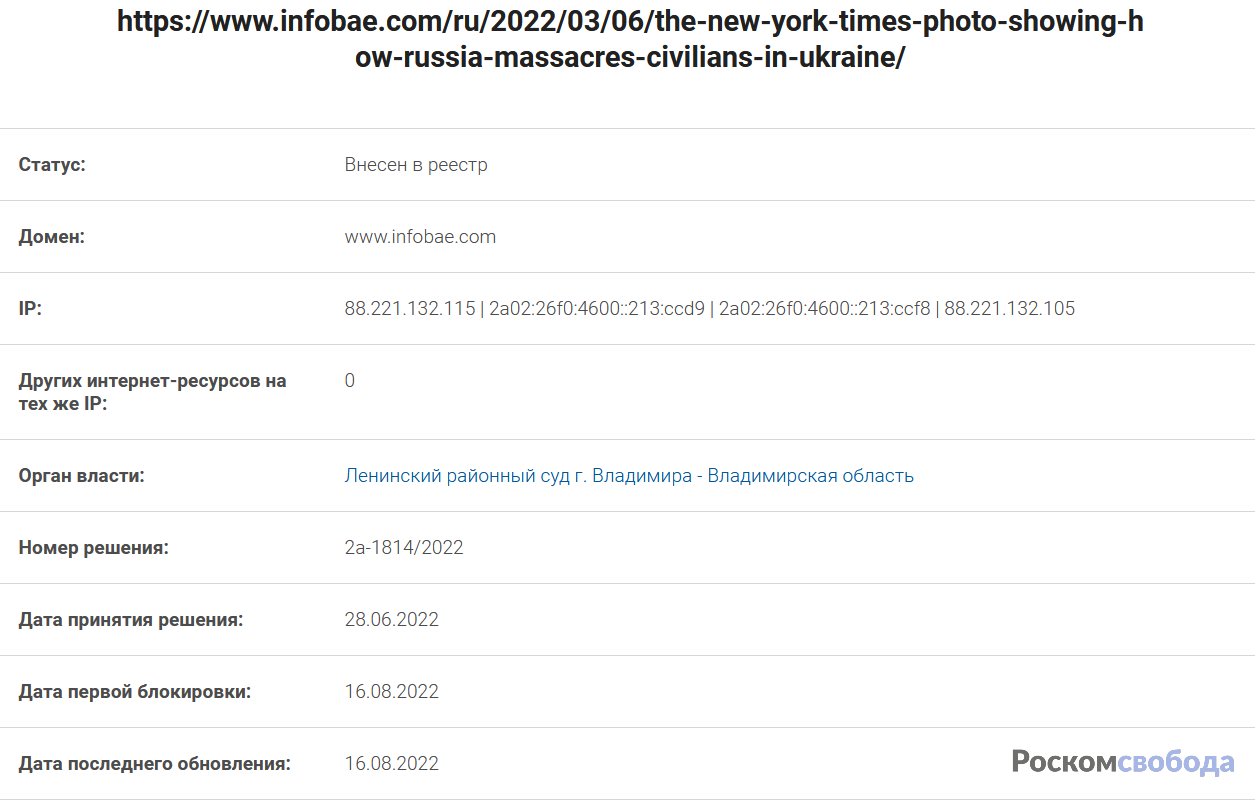 Проводя очередной мониторинг реестра заблокированных сайтов, мы обнаружили там блокировку статьи крупного аргентинского издания Infobae: