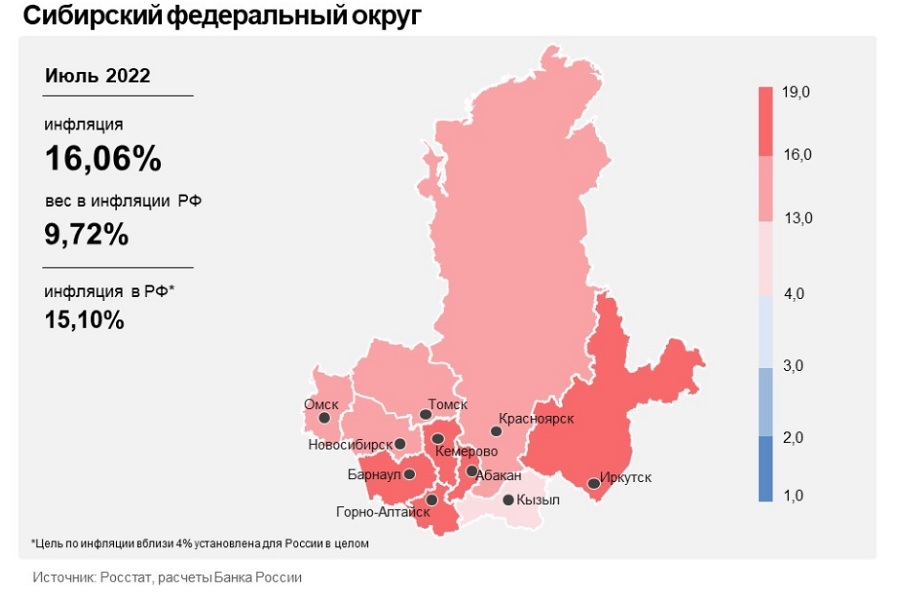 18:00 Годовая инфляция в Сибирском федеральном округе в июле замедлилась до 16,06% после 16,83% в июне, следует из данных Сибирского управления Банка России. При этом она осталась выше, чем в целом по России — 15,10%.