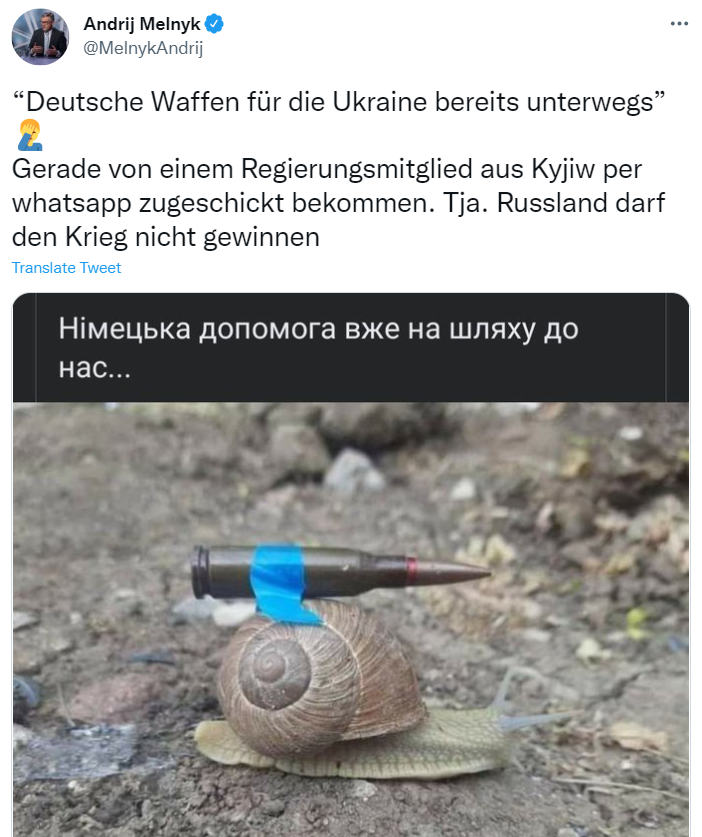 В конце мая Мельник опубликовал в Twitter иронический мем о военной помощи Украине от Германии — изображение улитки с патроном на панцире. Он подписал картинку: "Немецкая помощь уже на пути к нам". Сам посол объяснил, что получил картинку в мессенджере от чиновника из Киева.