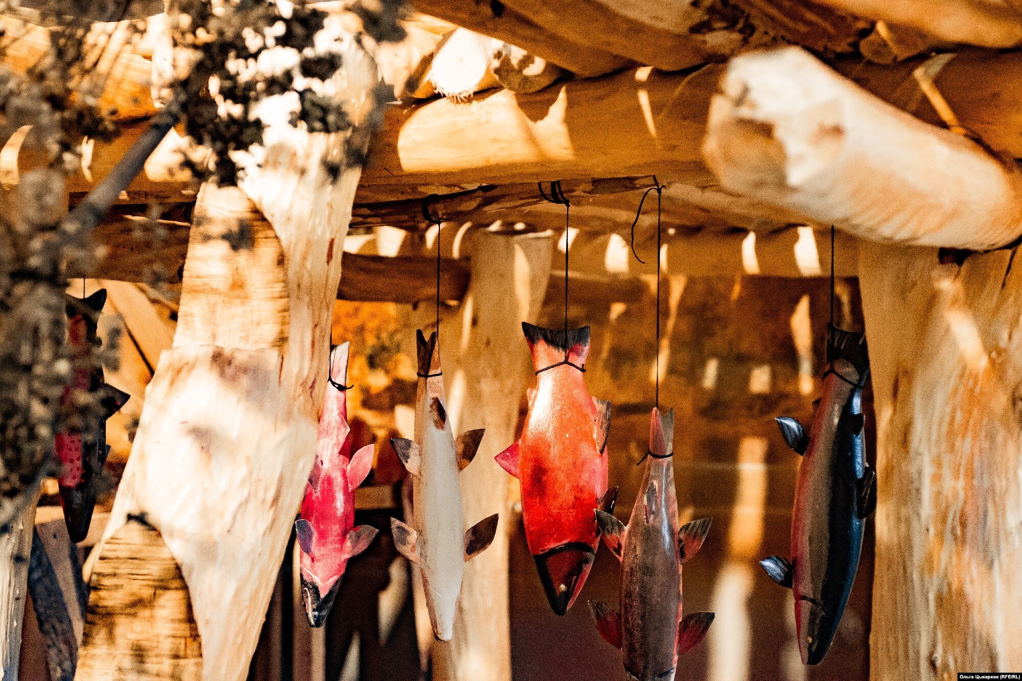 – Кутх создал Камчатку. Он увидел косяк рыбы. Вытащил одну и попросил, чтобы она стала землей для наших предков, ительменов. Вот оттуда наша рыбина! – рассказывает Елена Слободчикова по-ительменски.