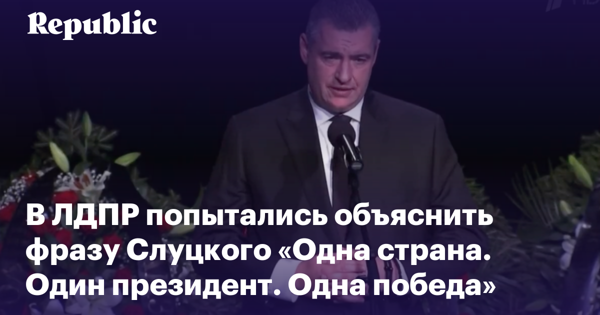 При этом в официальном канале ЛДПР в Telegram фрагмент выступления Слуцкого с фразой «Одна страна. Один президент. Одна победа!» вырезан. К слову, лозунг нацистской Германии тоже отражал поставленную нацистами задачу сплочения немцев в «единую народную общность».