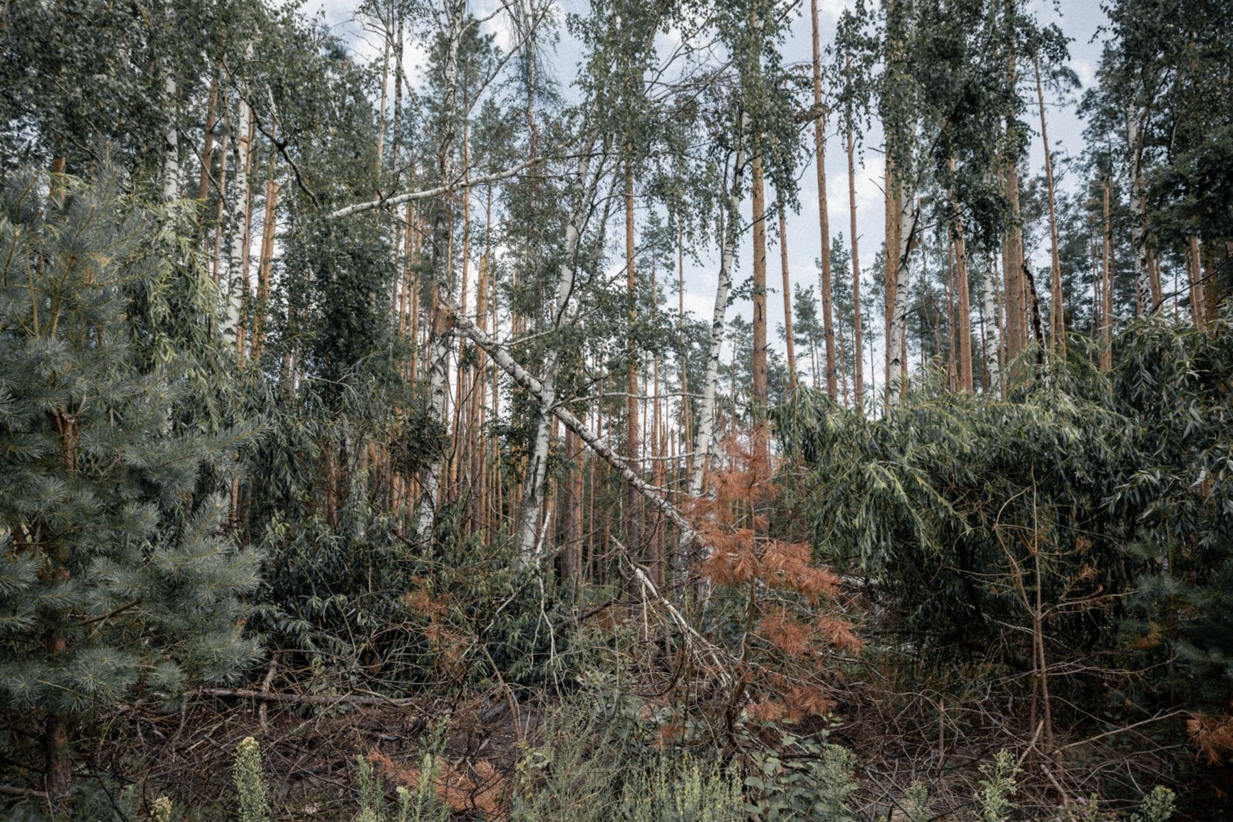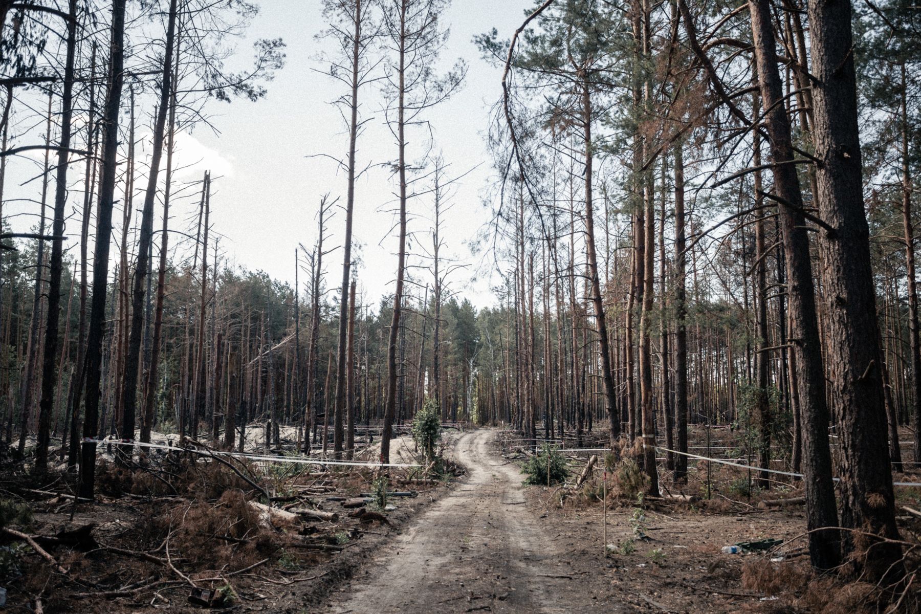 A slash in the bark of a birch sheet from artillery shelling. These “wounds” will take years to heal. Ukraine’s sappers have a formula: one day of combat requires one month of demining operations. To this day, they still find undetonated shells from the Second World War. The current war will make these areas uninhabitable for years.A forest near Bucha that was damaged by shelling. I was struck by the contrast between nature and human activity. We’ve gotten very good at killing one another. The sappers collect explosives they find behind the white ribbons. Roma [one of the sappers] told me that three sappers were killed when a collection like this one exploded.Near Bucha. These pine trees were damaged by shelling from a Grad multiple rocket launcher.