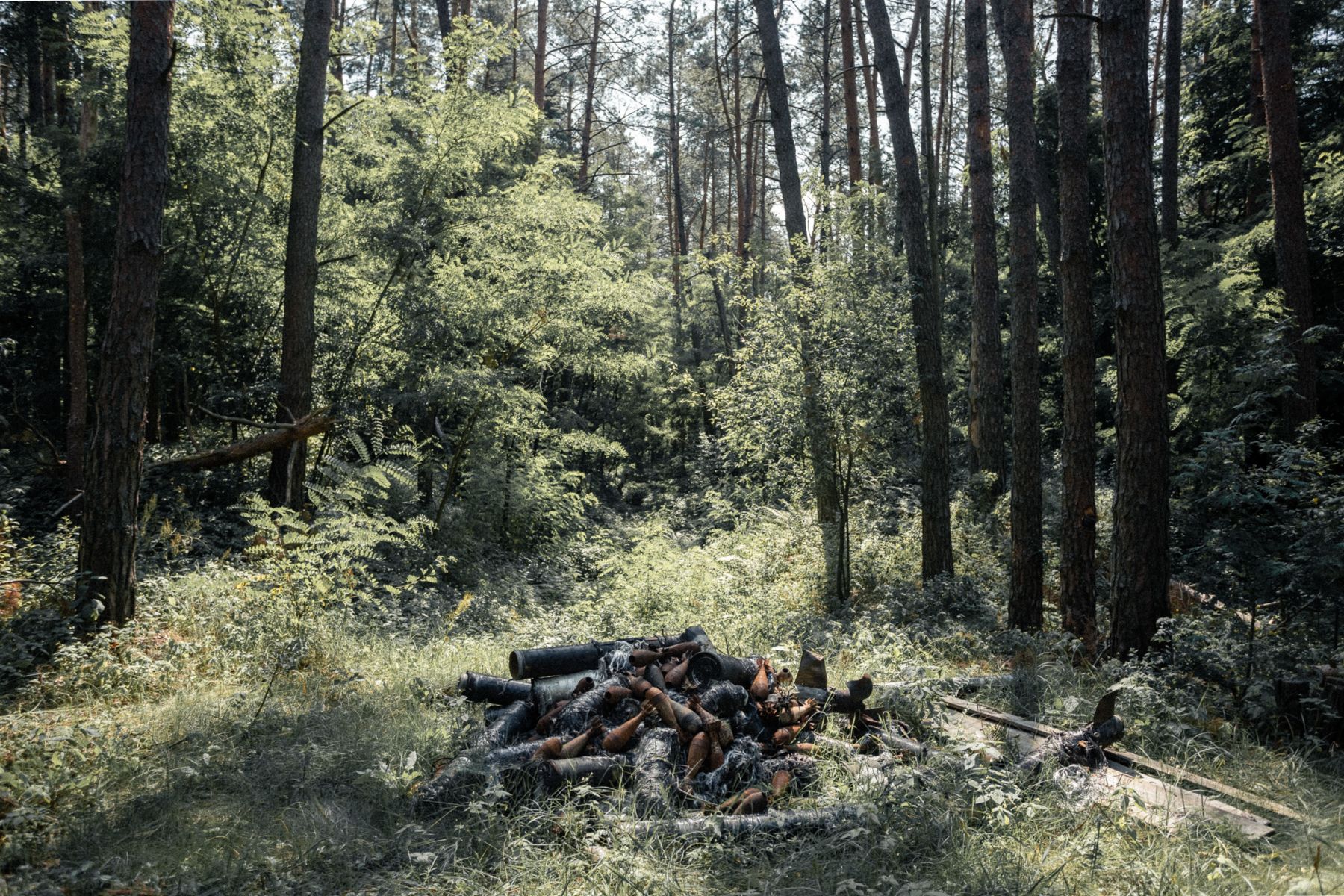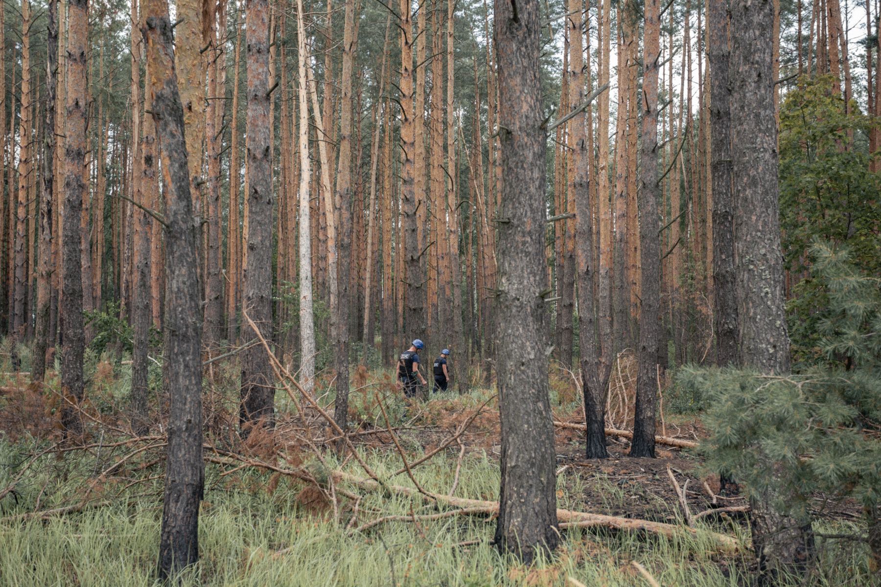 Уже пятый месяц каждый наш день начинается в восемь утра. После построения каждое подразделение из четырех-пяти человек выдвигается на закрепленные за ними участки. У нас уже 32 дня это лесной массив вблизи села Ягодное (было оккупировано российскими войсками с 3 по 31 марта, — прим. «Медузы»). Здесь наши военные разбили технику оккупантов и их боекомплект. Видите, тут лес выгоревший? Все поразбивалось и поразлеталось. Все, что можно было разглядеть глазами, уже очищено. Сейчас мы на этапе поиска боеприпасов с металлодетектором: при разлете [осколков после взрыва] что-то могло попасть в землю. В день очищаем немного — от десятка до ста квадратных метров, находим около 50 взрывоопасных предметов. Все зависит от того, насколько участок загрязнен. Вообще, тут не в сроках дело, а в качестве. В нашем деле никто не ставит временные рамки.