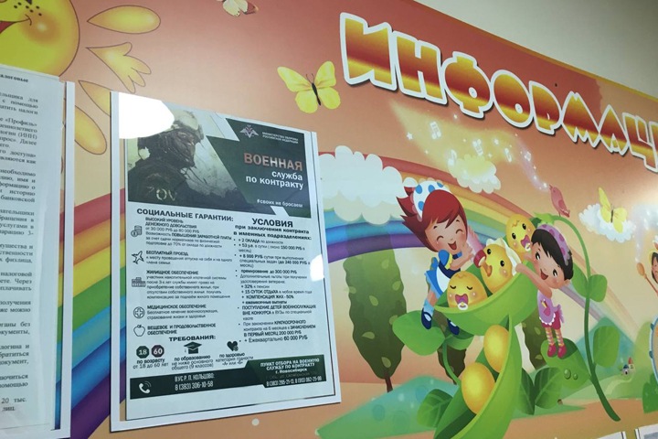 11:03 Объявление о наборе в армию по контракту повесили прямо в детском саду «Золотой ключик» наукограда Кольцово Новосибирской области. Фото опубликовал телеграм-канал «Сибирьмедиа».
