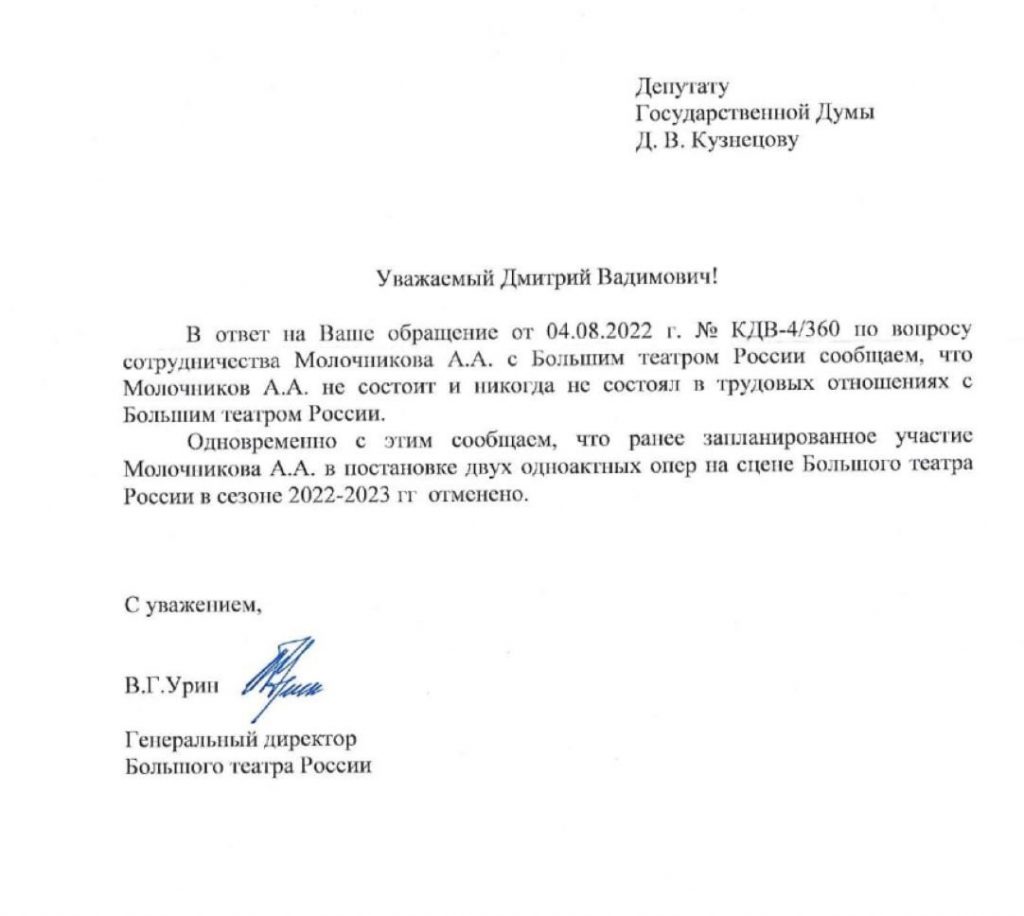 «Мы не боремся с чиновниками и управленцами от культуры. Мы помогаем им. На том и будем стоять», — прокомментировал решение Большого театра Дмитрий Кузнецов.