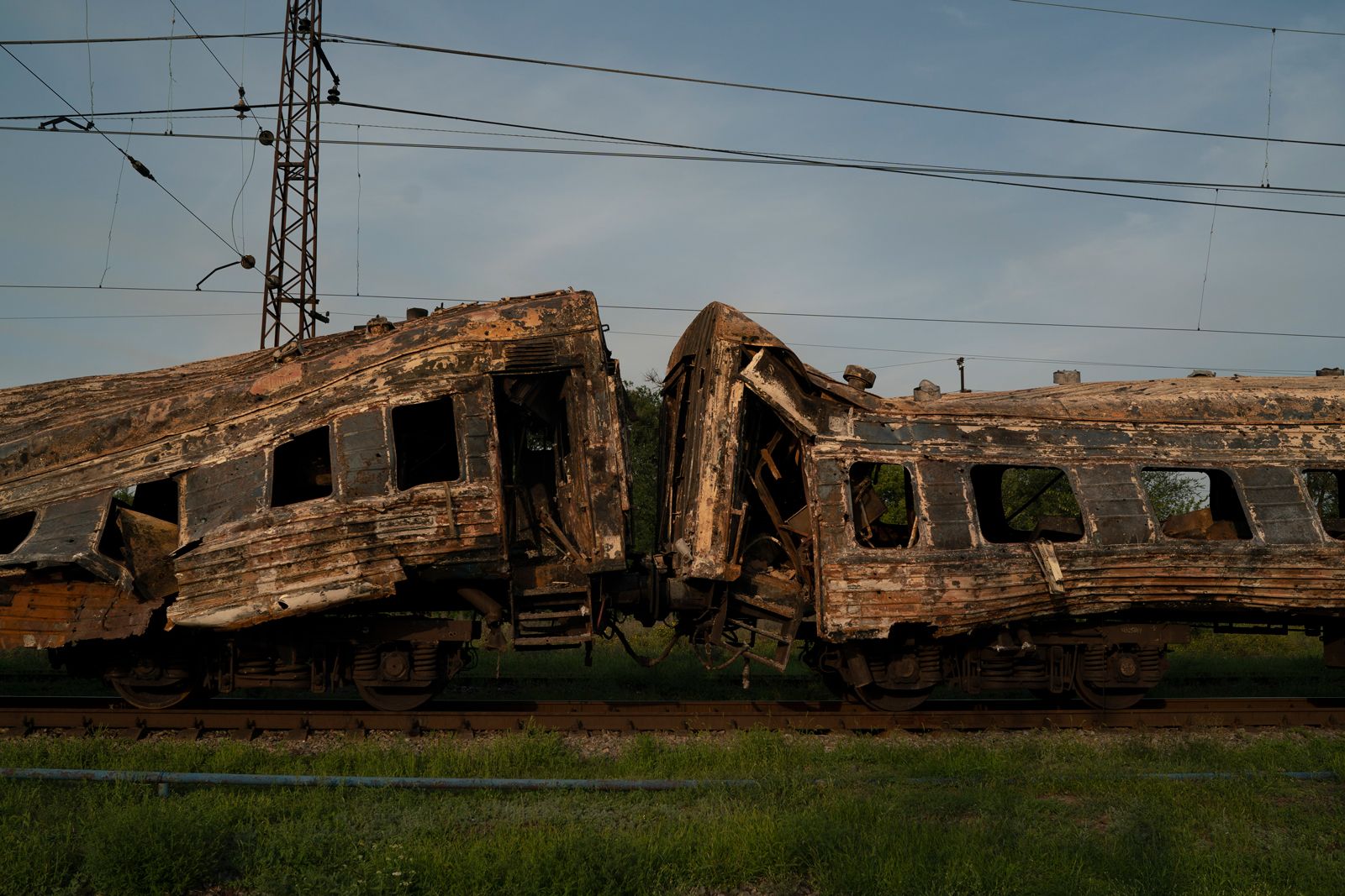 Поврежденный поезд в Чаплино Днепропетровской области, где после обстрела железнодорожной станции, по данным Киева, погибли 25 человек