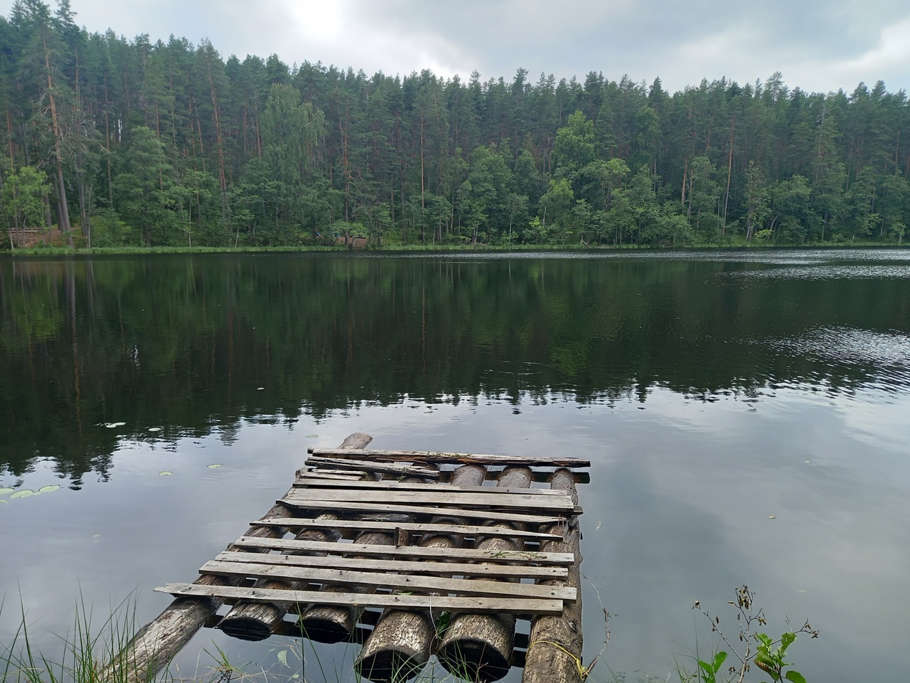 Идем вдоль Дубовых озер. На некоторых картах три озера обозначены как одно длинное Дубовое озеро. Но это, неверно, все озера разделены болотистыми зарослями, через которые переплыть или нельзя, или очень трудно, поэтому они представляют собой отдельные водоемы. Первое озеро больше всего заболочено, подходов к воде мало. Можно рыбачить или купаться вот с таких мостков.