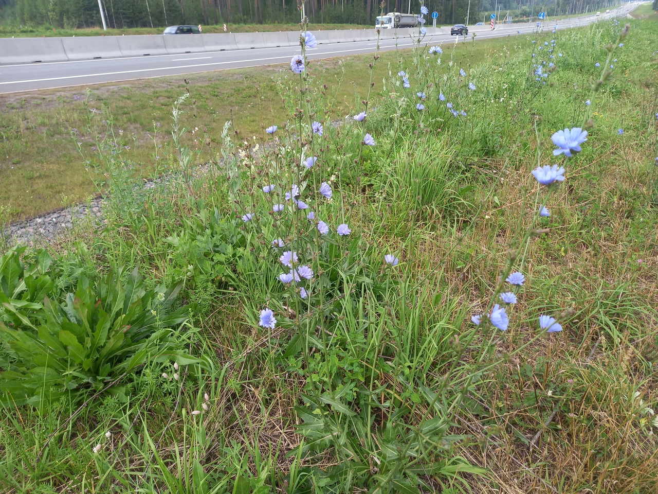 Дальше нам нужно пересечь трассу «Сортавала», которая рассекает заказник на две части. В любом месте ее перейти нельзя - это и опасно и барьер в середине не даст. Поэтому мы пройдем двести метров до мостика через реку и перейдем трассу под мостом. Хотя озера расположены прямо за шоссе, напротив нас, но приходится сделать этот крюк. Возле трассы красиво растет цикорий.