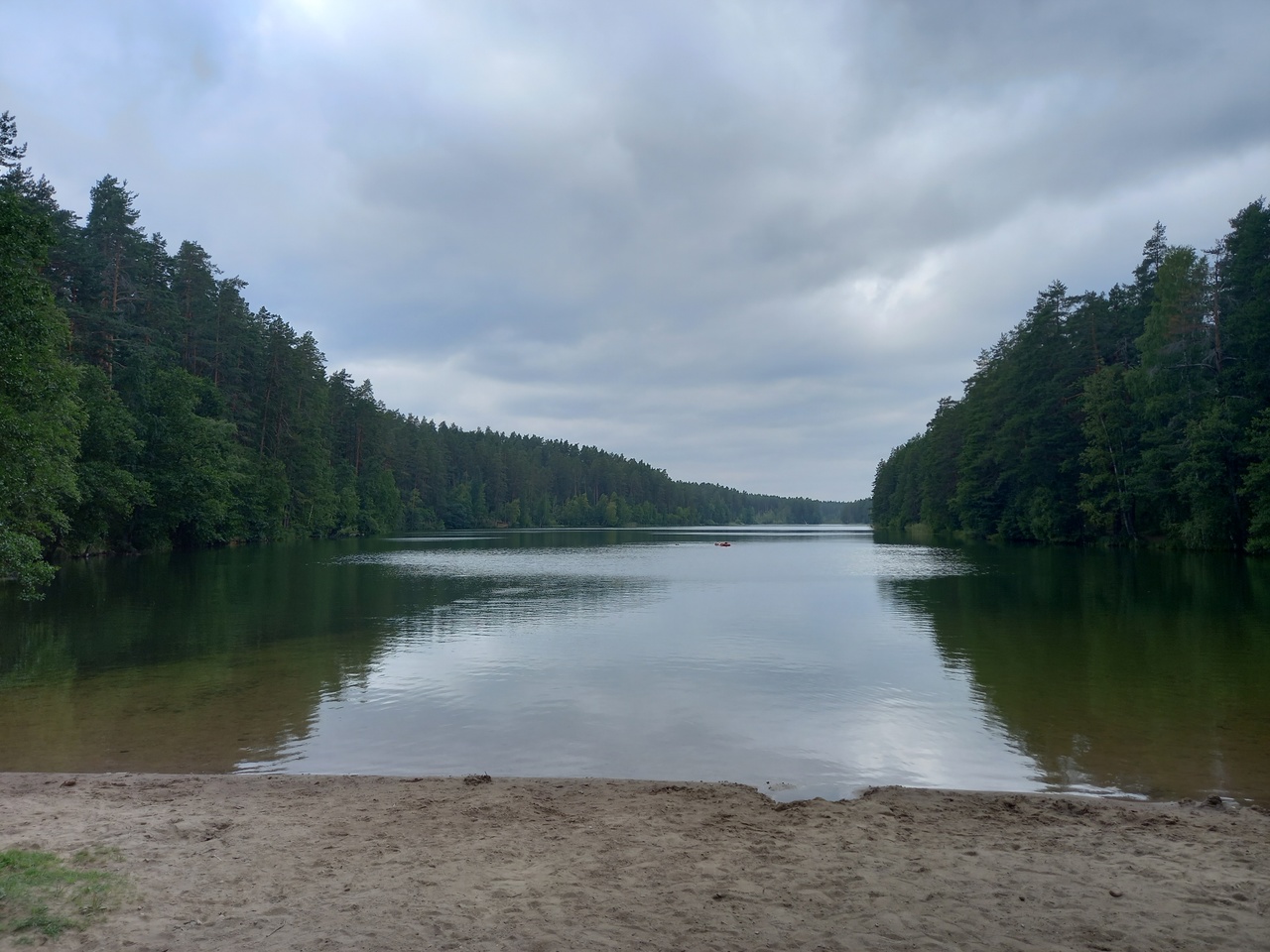 Начало Берестовых озер. На карте их тоже часто называют одним Берестовым озером, но, по сути, это два водоема, соединенных узкой протокой. Здесь мы видим шикарный песчаный пляж. И с него открывается потрясающий вид!