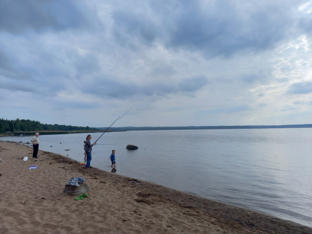 Это не та Вуокса, что в Приозерске, это другая часть озерно-речной системы, которая находится южнее, - возле Лосево. Возле этого пляжа поселок Варшко, который по сути является окраиной Лосево. Здесь мы увидели местных рыбаков. Вуокса славится обилием рыбы.