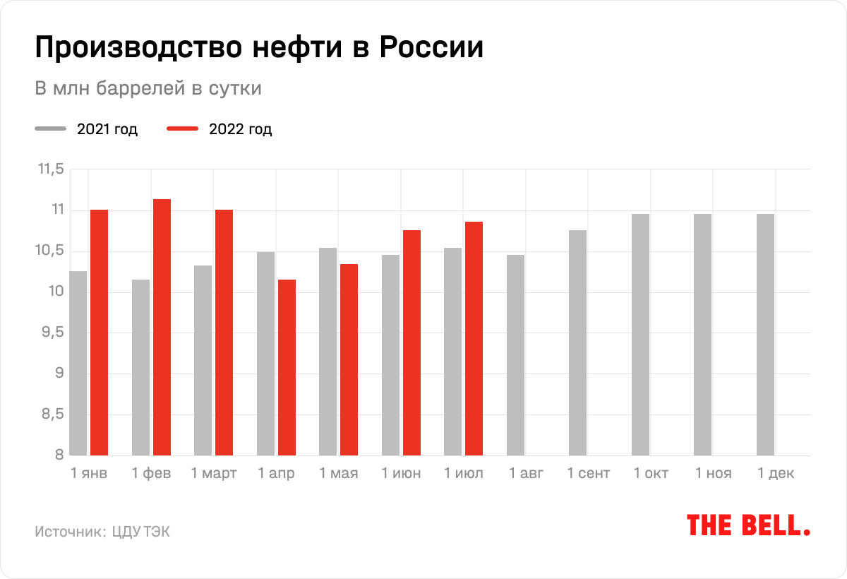 Основные проблемы будут в следующем году. Вступление в силу эмбарго означает, что половину нефтяного экспорта, которая приходилась на Европу, надо будет перенаправить, а с этим будут сложности. В первые две недели августа среднесуточная добыча нефти в России упала на 3% месяц к месяцу. Морской экспорт нефти из российских портов в Азию, по данным Bloomberg, в августе уже снижается три недели подряд. Это вызывает опасения, что азиатский регион уже насыщен российской нефтью и не может принять дополнительные объемы.