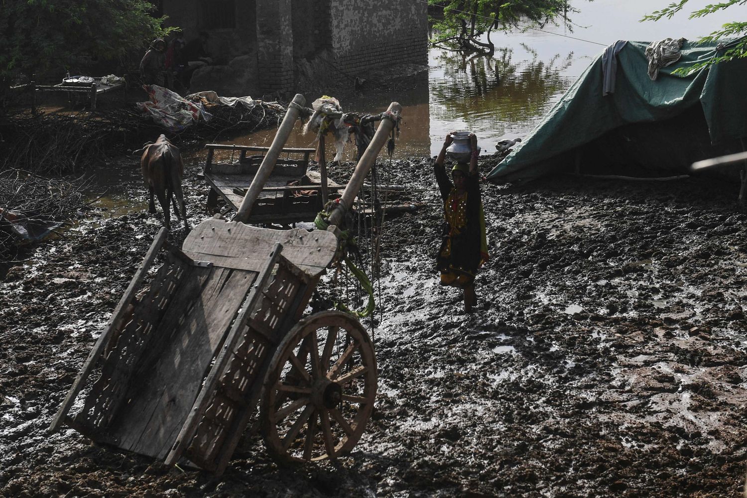 Asif Hassan / AFP / Scanpix / LETA Женщина несет кувшин с водой, пробираясь сквозь оставшуюся после потопа грязь в городе Джейкобабад