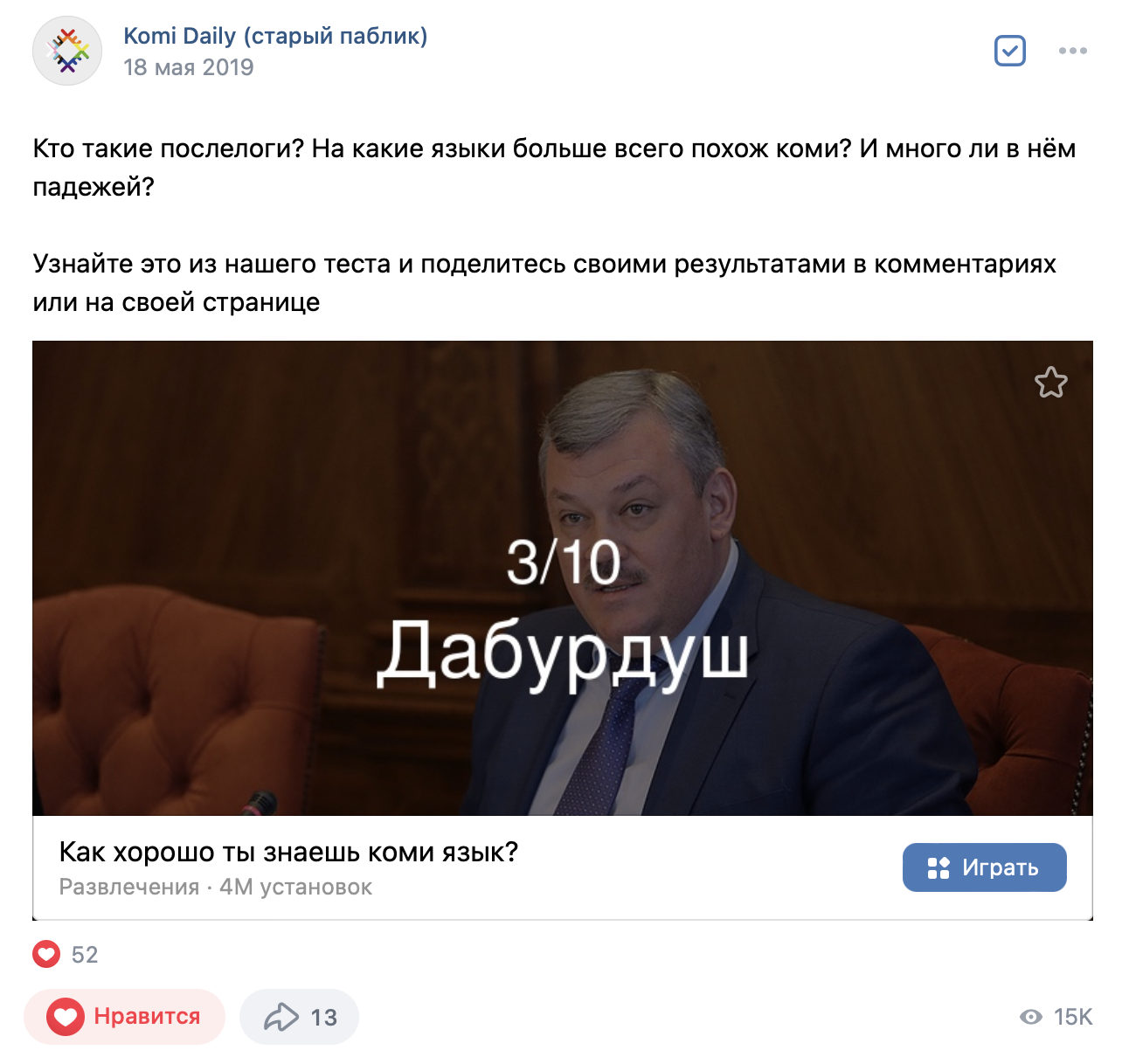 Основной язык публикаций был выбран русский — чтобы охватить как можно больше тех людей, которые не сильно интересуются коми культурой, но могли бы ей заинтересоваться.