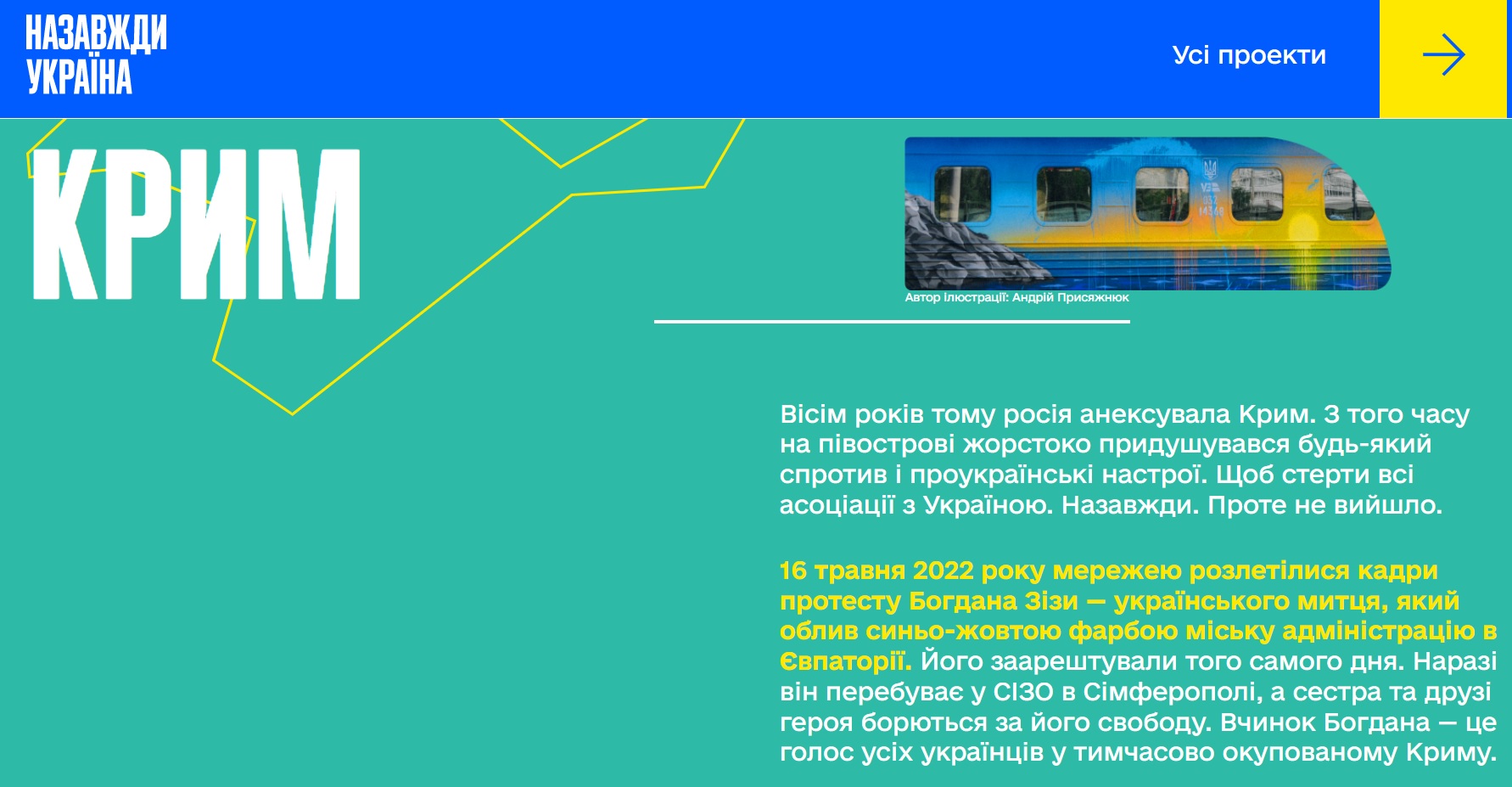 «Восемь лет назад Россия аннексировала Крым. С тех пор на полуострове жестко подавлялось любое сопротивление и проукраинские настроения. Чтобы стереть все ассоциации с Украиной. Навсегда. Но не вышло. 16 мая 2022 года по сети разлетелись кадры протеста Богдана Зизы – украинского художника, который облил сине-желтой краской городскую администрацию в Евпатории. Его арестовали в тот же день. Сейчас он находится в СИЗО в Симферополе, а сестра и друзья героя борются за его свободу. Поступок Богдана – это голос всех украинцев во временно оккупированном Крыму», – сообщают авторы проекта.