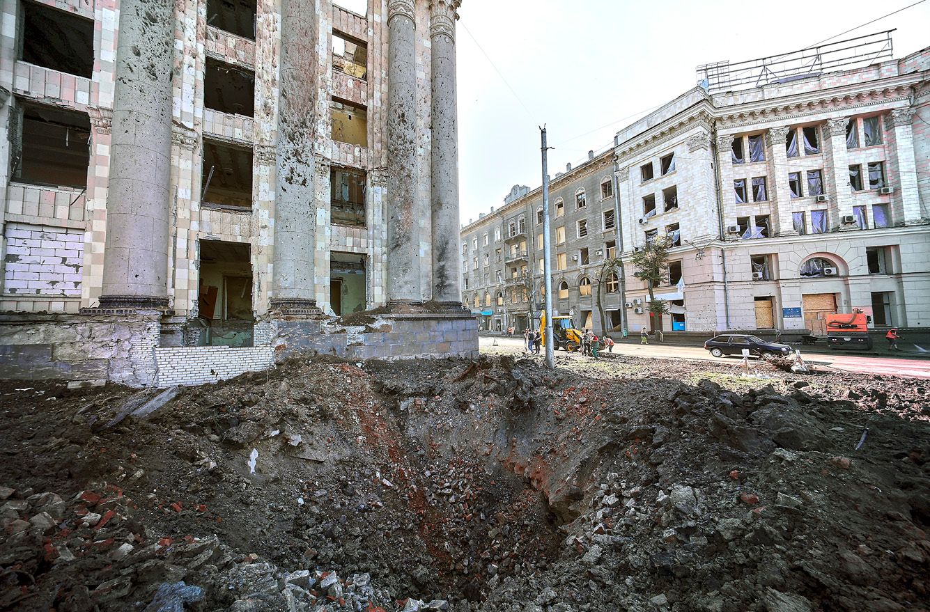 Sergey Kozlov / EPA / Scanpix / LETA Воронка рядом со зданием областной администрации Харькова, оставшаяся после ракетного обстрела города. О пострадавших и погибших не сообщалосьSergey Bobok / AFP / Scanpix / LETA Жители Харькова смотрят на разрушенное в результате ракетного удара здание. По данным проекта «Беларускі Гаюн», российские самолеты обстреляли Украину с территории Беларуси
