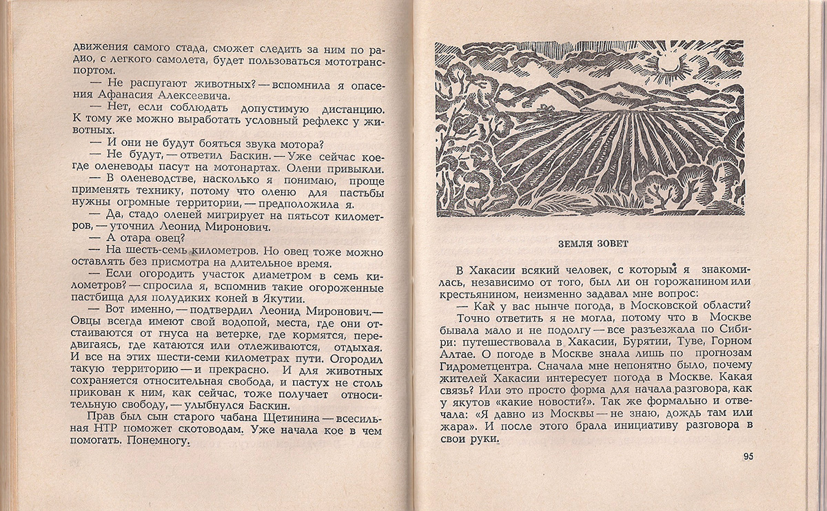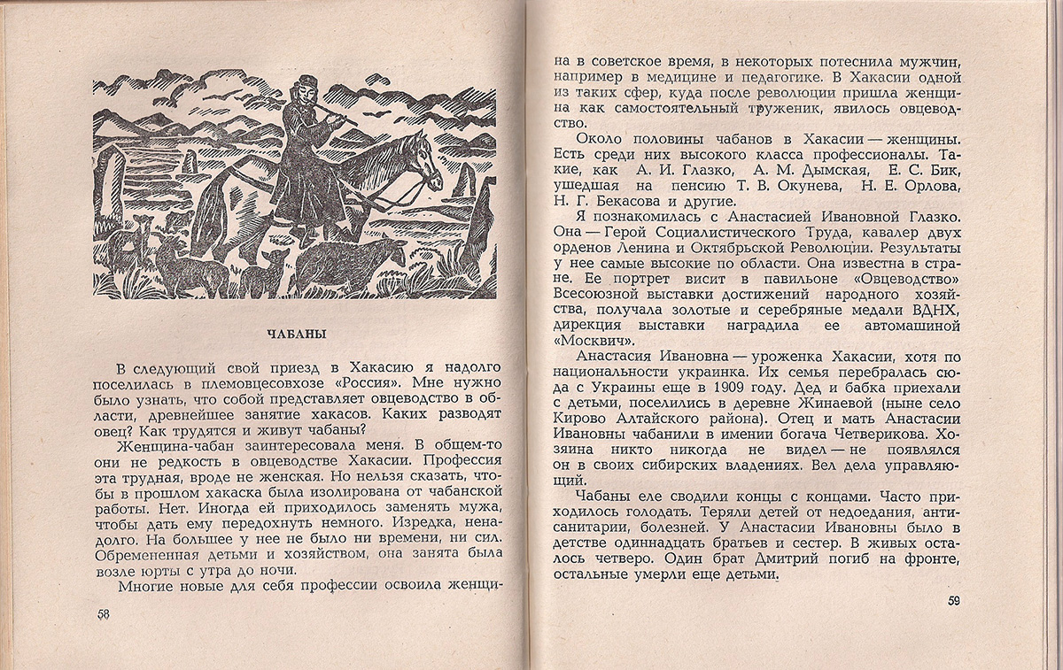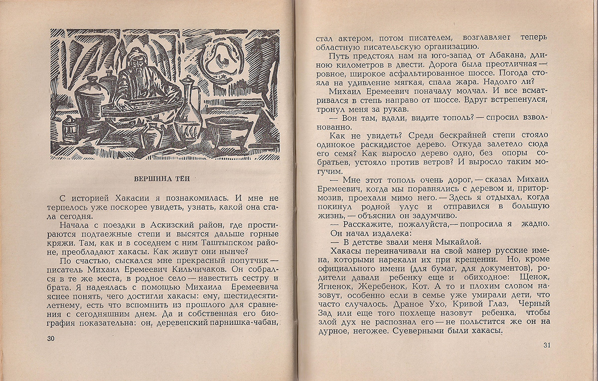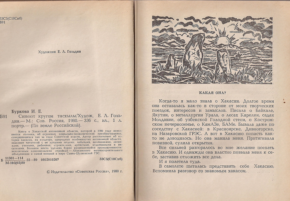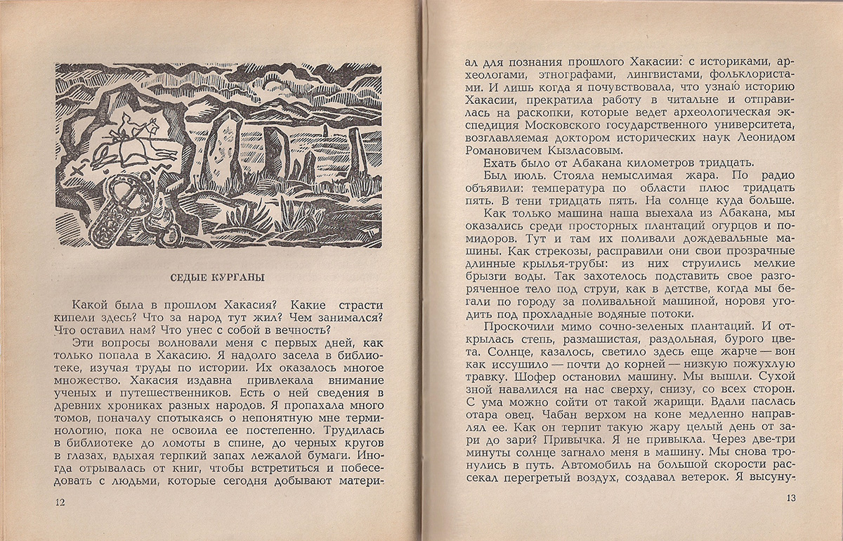 «Когда-то я мало знала о Хакасии» — вступительное признание автора приободрило: значит, на старте будем в равных условиях. Перелистал, полюбовался незатейливыми, но трогательными черно-белыми иллюстрациями, на которых горы (те самые тасхылы), степи, заводы, фабрики. Титульный лист украшен фотографией авторки: крепкого вида женщина с короткой стрижкой ласкает печальную овчарку. Моя компания на ближайшие несколько дней.