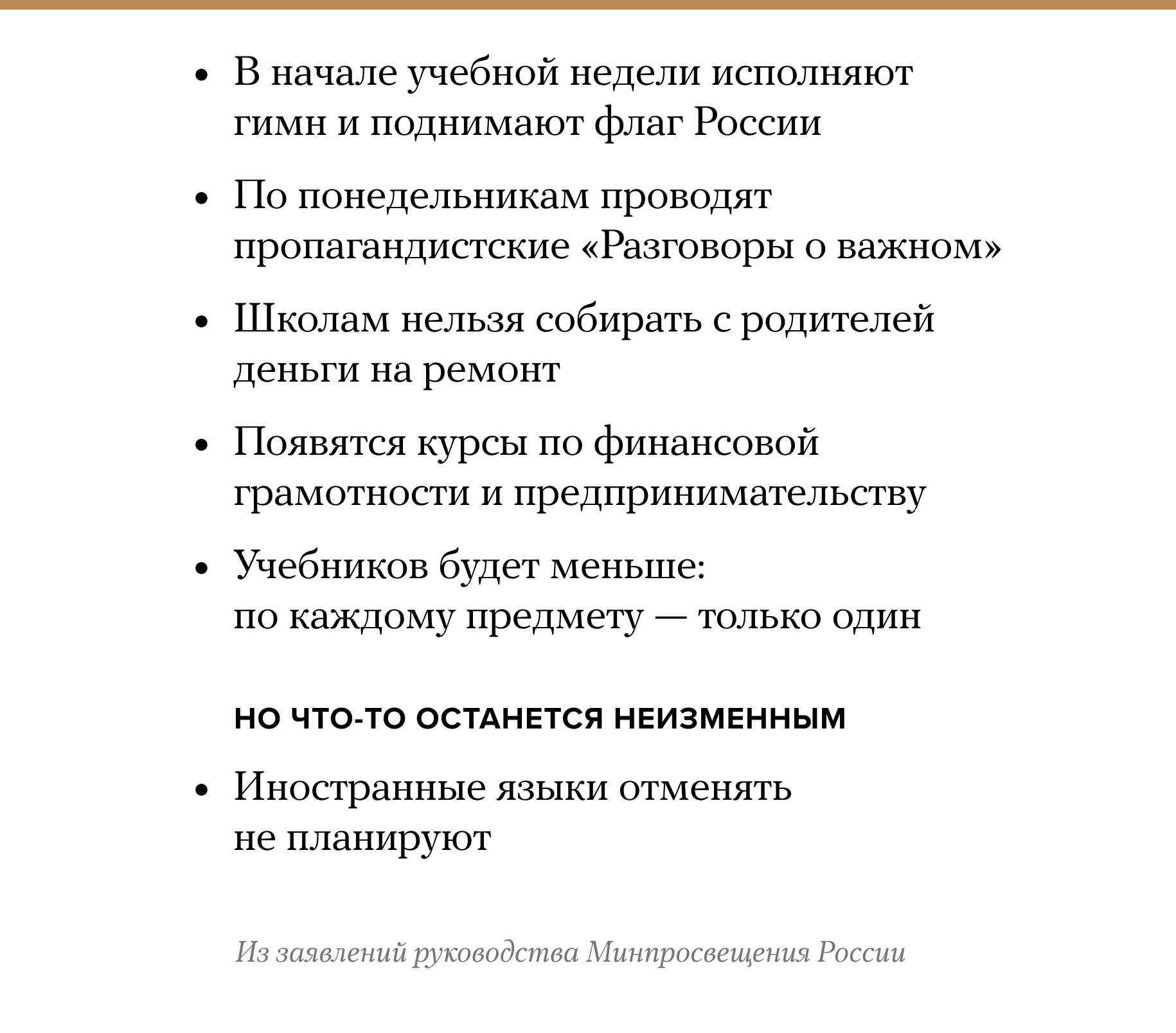 С 1 сентября учебная неделя в школах России будет начинаться с церемонии, на которой станут исполнять российский гимн и поднимать флаг России. Школам рекомендовали каждый понедельник начинать с «Разговоров о важном» — внеклассного занятия, где будут рассказывать о «подвигах» российских военных в Украине. 1 сентября Владимир Путин проведет открытый урок «Разговор о важном» в Калининграде. Российские учителя призвали педагогов и родителей бойкотировать «Разговоры». Министр просвещения РФ Сергей Кравцов в преддверии Дня знаний заявил, что на уроках нельзя использовать мобильные телефоны (в Роспотребнадзоре напомнили, что этому запрету уже год). Кравцов также сообщил, что школы не должны собирать с родителей деньги на ремонт: «Это уголовное дело». А замминистра просвещения Татьяна Васильева заверила, что в школах не станут запрещать иностранные языки «недружественных стран», к которым относят почти всю Европу.