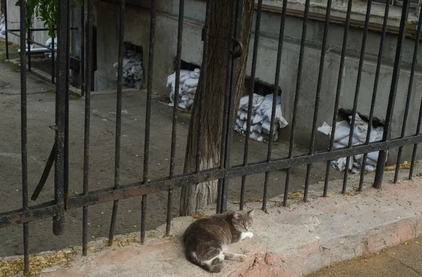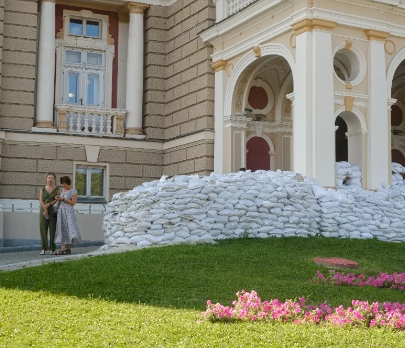 The entrance to the Duke of Richelieu Monument and the Potemkin Stairs is closed: restricted area. The beaches are officially closed: there is danger of mines. Storefronts and windows of historic buildings located in the centre of the city have been boarded up to protect from attacks or, in some cases, in the aftermath of the attacks. There are flags hanging on buildings, balconies, flagpoles near shops, restaurants, and banks. Blue-yellow rectangles are drawn on walls and gates. There is a flag of Ukraine placed even near the bronze François Sainte de Wollant that stands near the pedestal of the monument to Catherine the Great.