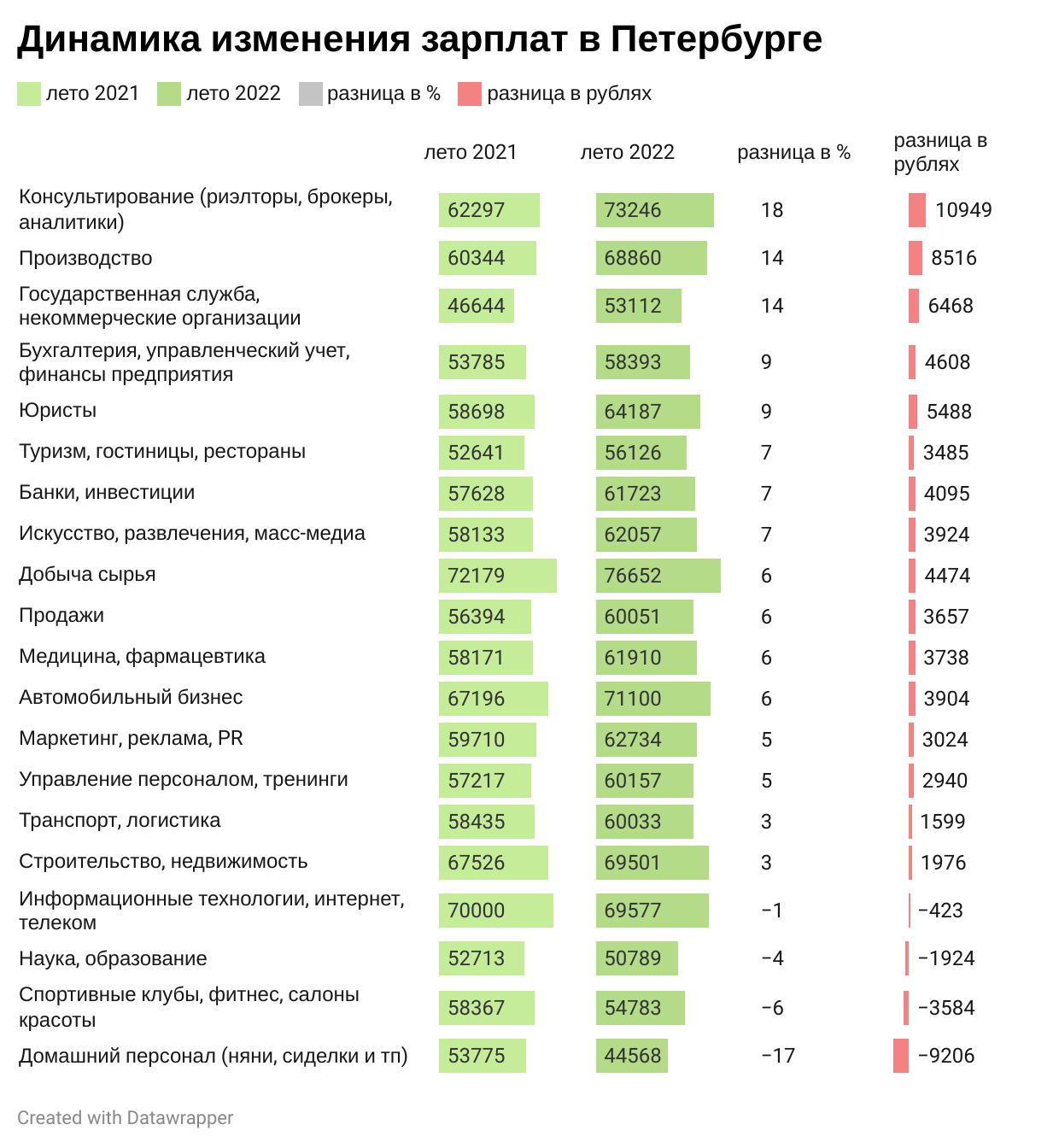 В каких сферах зарплаты изменились сильнее всего. Самый большой рост зарплат — в сферах консультирования, производства и госслужбы. При этом летом 2022 года, по сравнению с прошлогодним периодом, оплата труда упала в сфере домашнего и обслуживающего персонала, фитнеса и красоты, а также в области науки и образования.