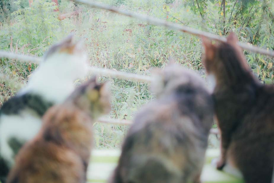 Если зайти в выгул, кошки спрыгивают с полок, вылазят из кошачьих домов, встают с лежанок и когтеточек, несутся к людям, трутся об ноги. Некоторые наблюдают вошедших на расстоянии.