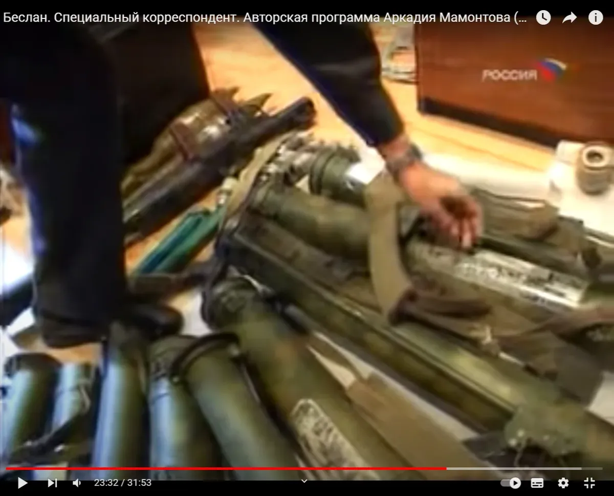 Через девять дней после штурма в Беслане, 12 сентября 2004 года, на канале ВГТРК вышла авторская программа спецкора Аркадия Мамонтова. На 23-й минуте сюжета камера оператора медленно проплывает над оружием, изъятым следователями после штурма в здании школы № 1.