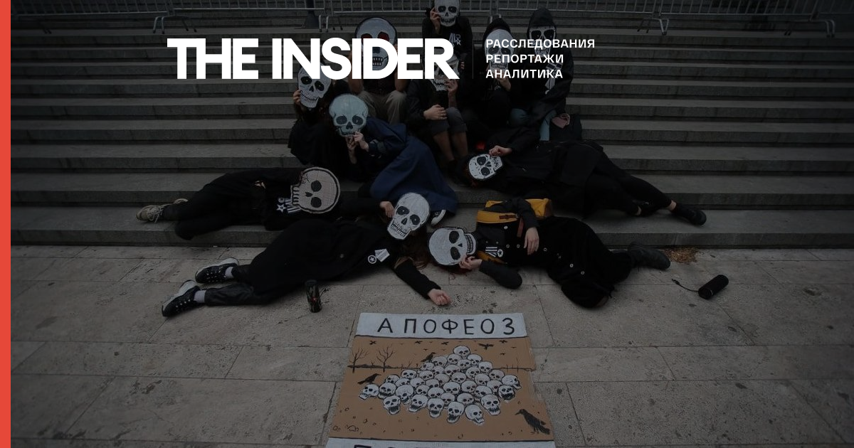 Активисты встали под надписью «Это нужно не мертвым, это нужно живым» в масках скелетов с плакатами «Мало им трупов» и «Среди мертвых нет патриотов».
